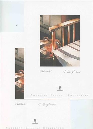 There are 2 American Airlines Coach Class Menus with the same Cover of Solitude by D Denghausen. Both are single page 2 sided menus. One has breakfast and the other has dinner. Each measures about 6 1/2" x 9" . Both are coded P-DA-SH and are dated 8/00. The dinner selections are by Dean Fearing when he was the Executive Chef at the Mansion on Turtle Creek in Dallas Texas.