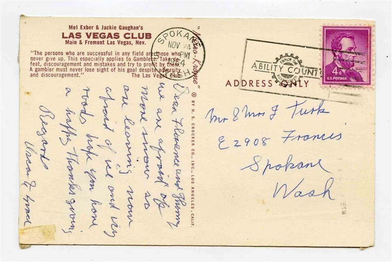 A used postcard, mailed from Spokane Washington in 1954 Mel Exber and Jackie Gaughan's Las Vegas Club at Main and Fremont in Las Vegas Nevada