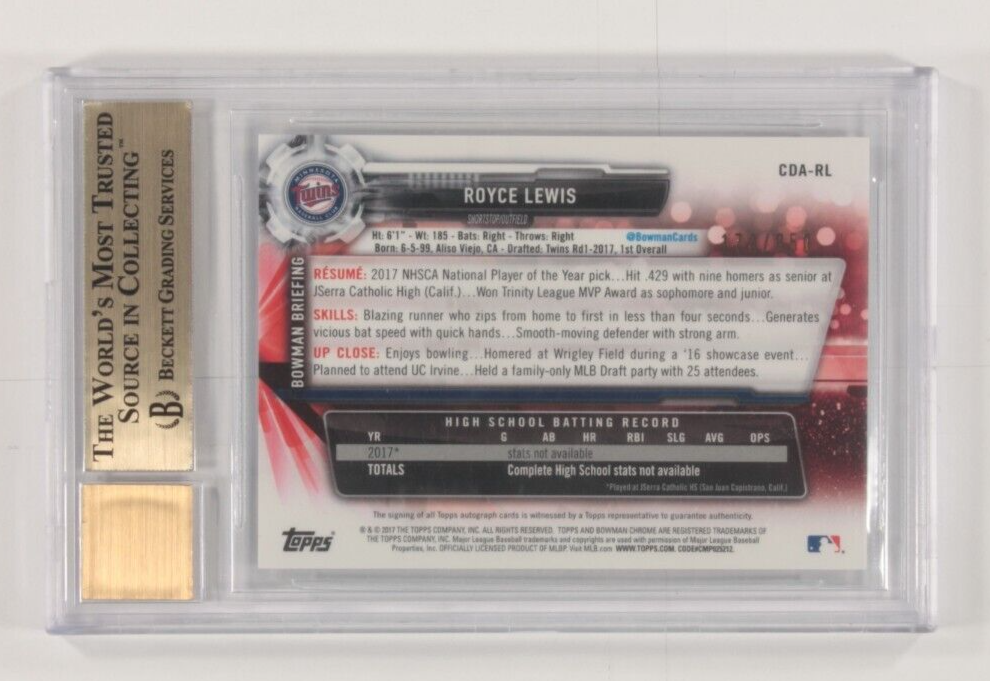 2017 Bowman Chrome Draft Autographs Royce Lewis Purple Refr. BGS 9.5 Gem #CDARL