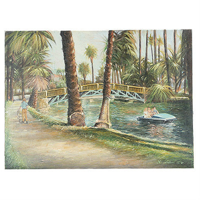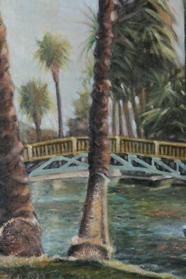 Recreacion a lo largo del río (río con palmeras y pintura al oleo de botes de remo de Anthony Sidoni