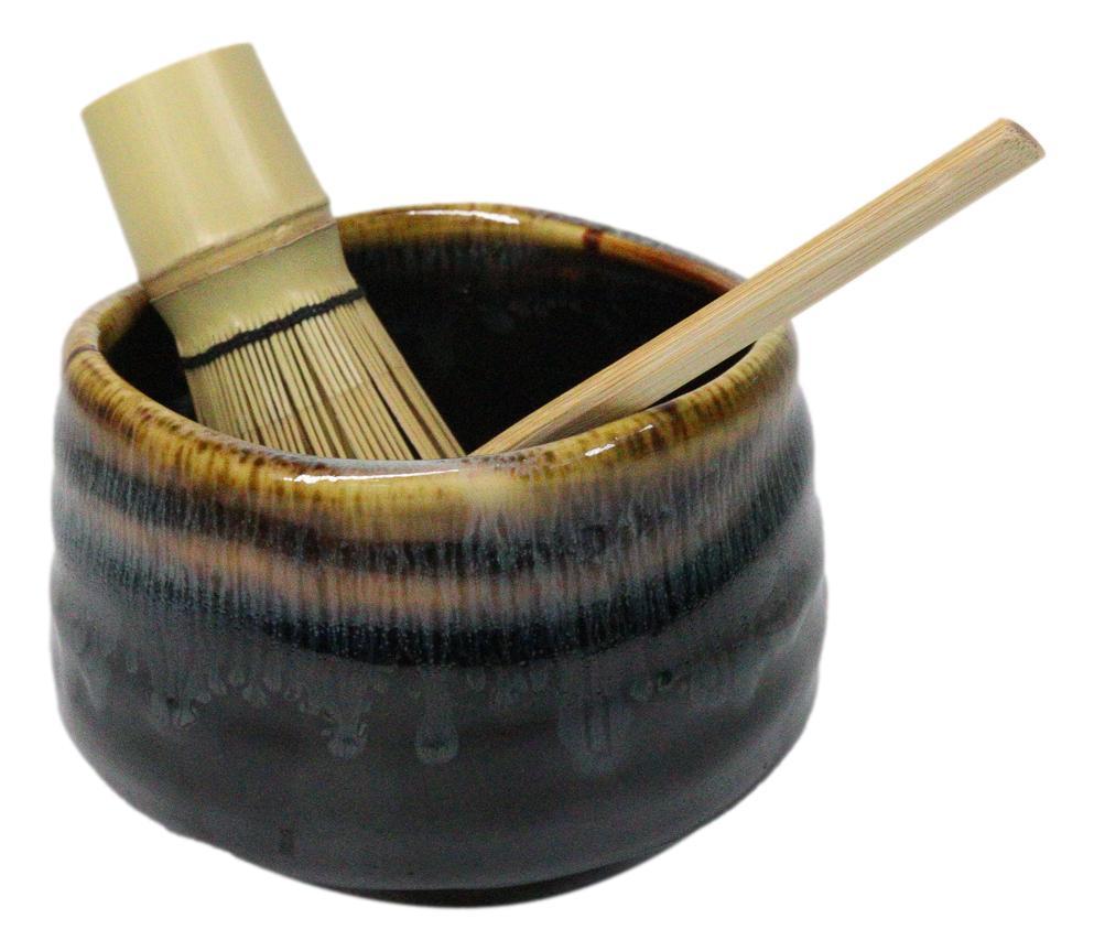 Black Brown Waterfall Ceramic Japanese Matcha Green Tea Bowl Whisk & Scoop Set