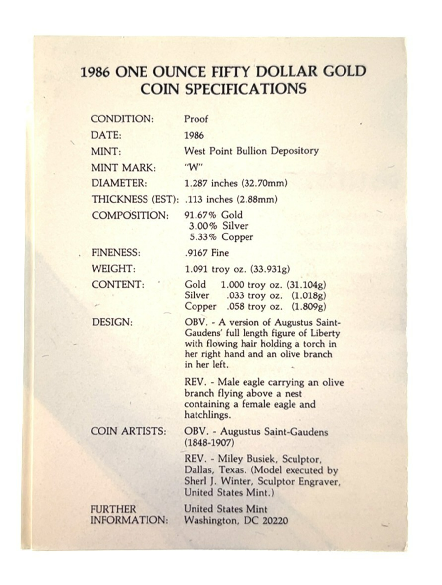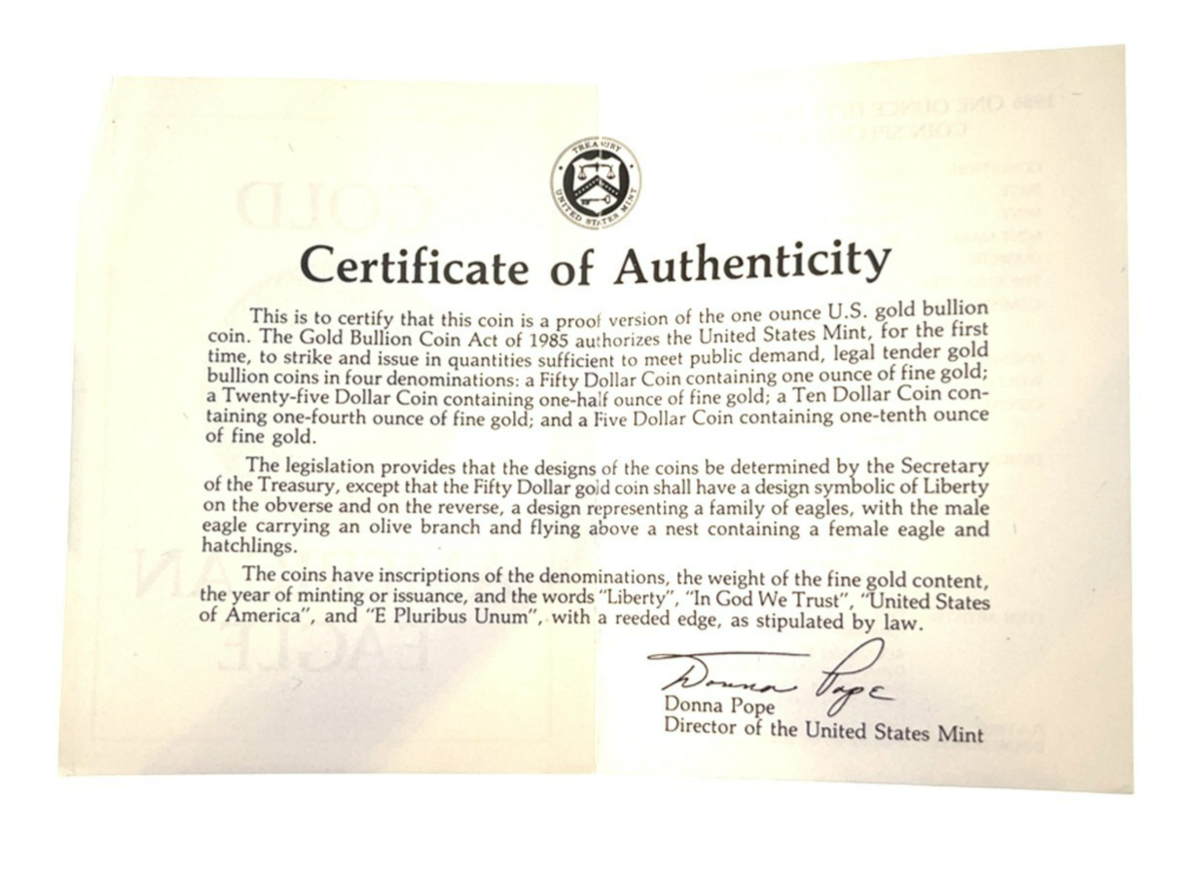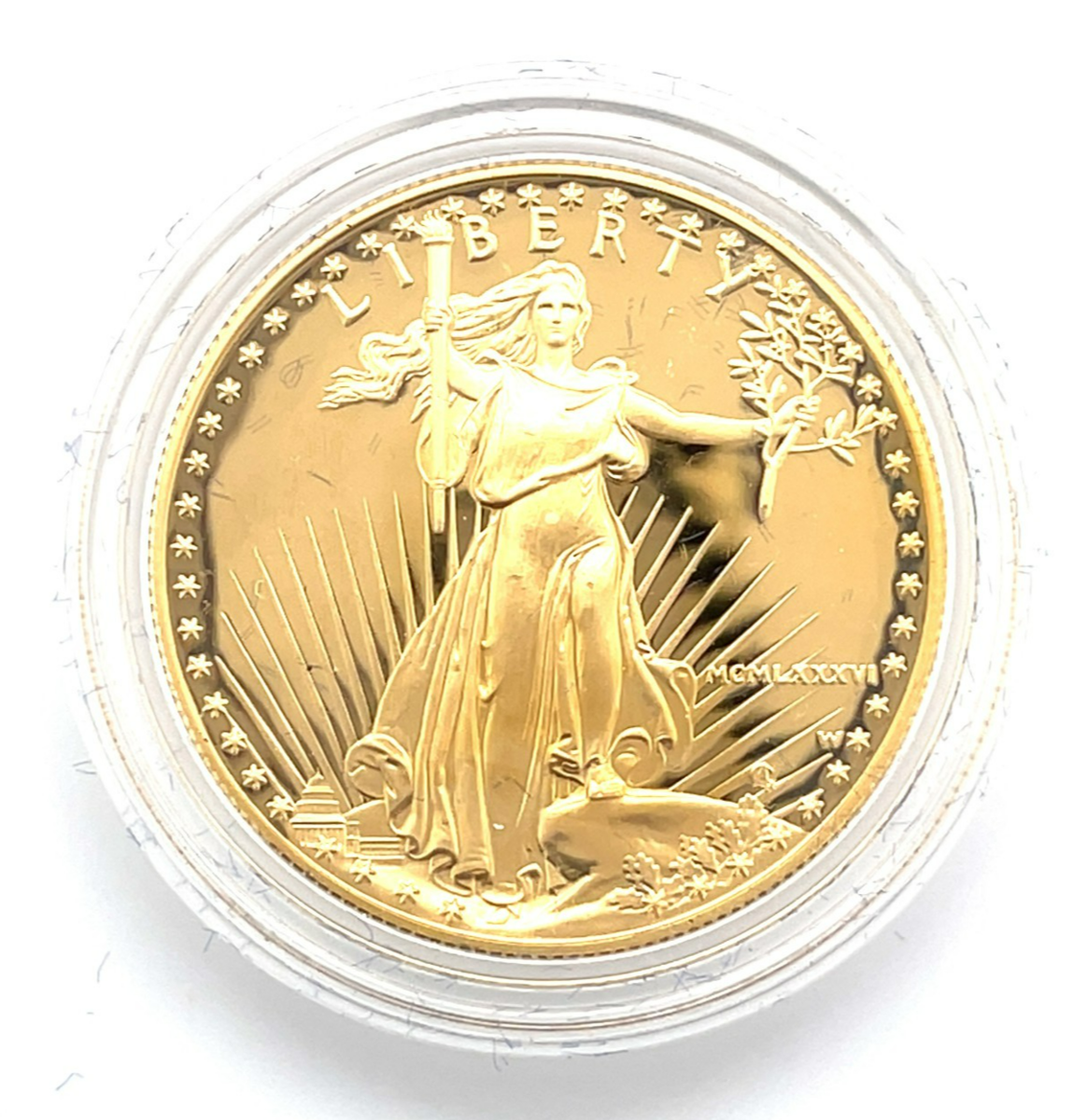 Moneta D'Oro Americana Eagle Proof Da 1 OZ Del 1986 Con Scatola E Documenti