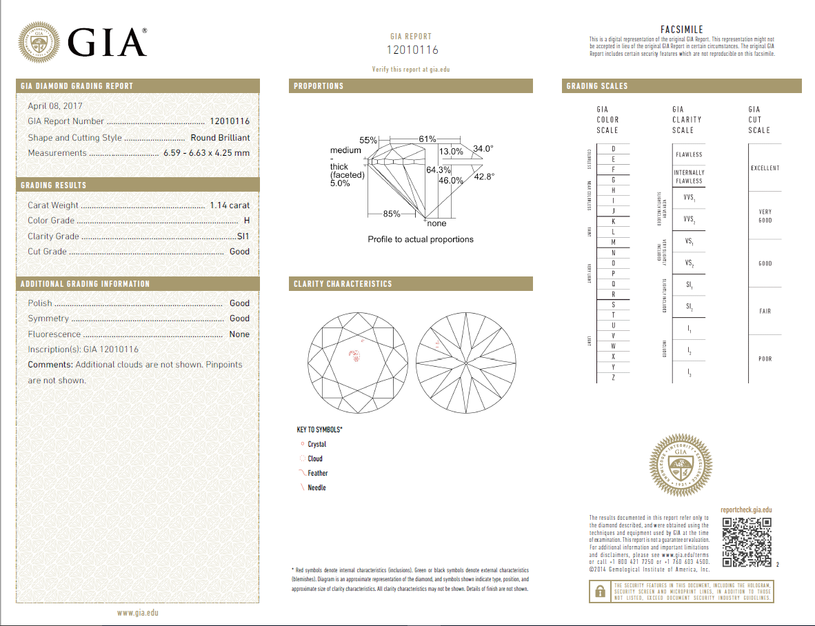 1.14 Carat sciolto H/ Si1 certificato Diamond Gia taglio brillante rotondo