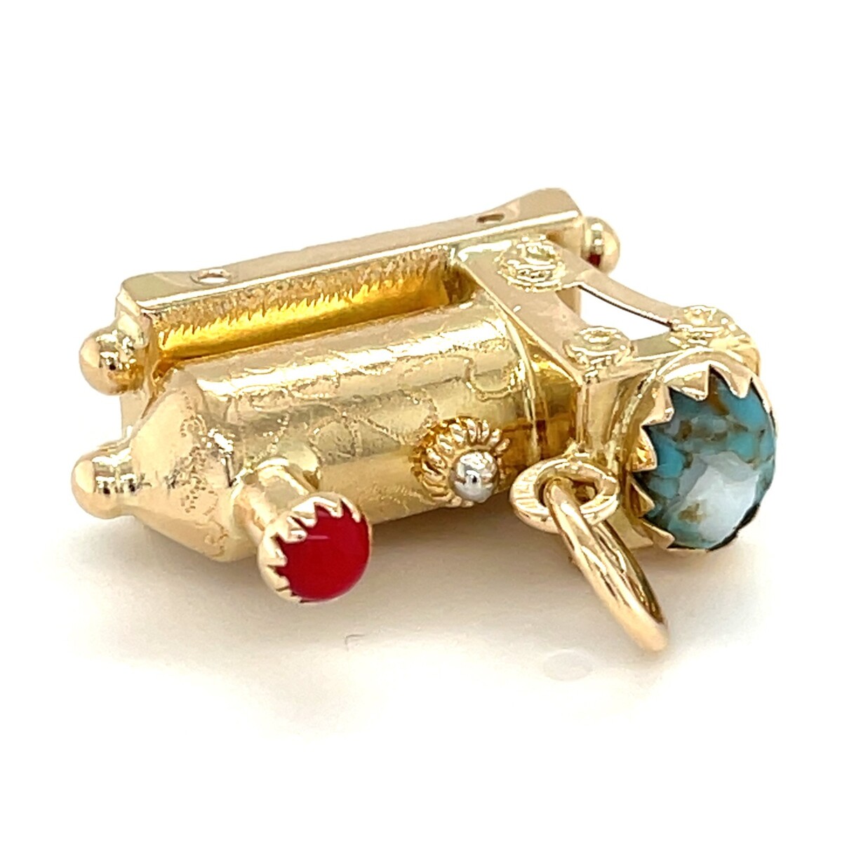 14K Gelbgold Zug Anhanger Mit Koralle und Türkis Akzent Ring