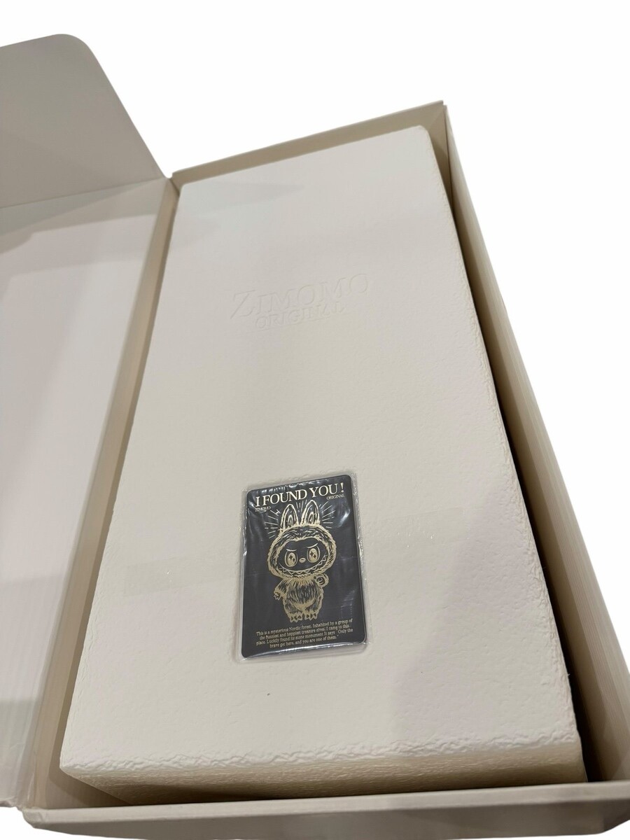 Beautiful ZIMOMO Original designer plush collectible in brand new condition with complete packaging. This premium art toy includes the ZIMOMO plush figure sealed in protective plastic, the original ZIMOMO presentation box, foam insert, and the collectible ?I FOUND YOU!? card accessory. The plush features the signature monster design with star eyes, detailed fur texture, and the original necklace tag.