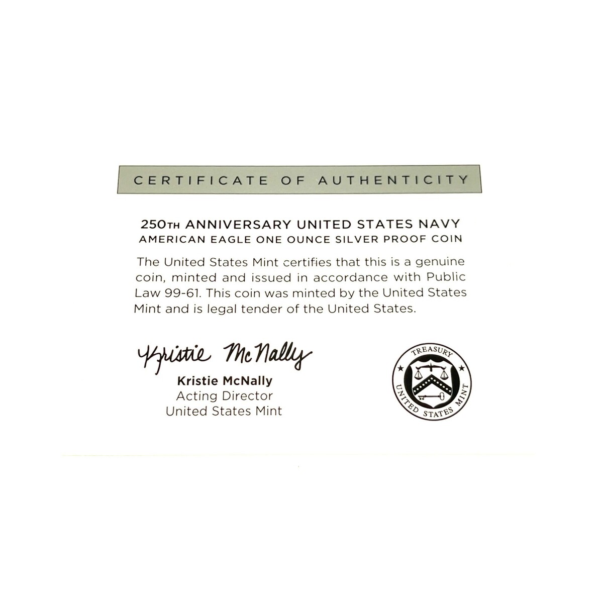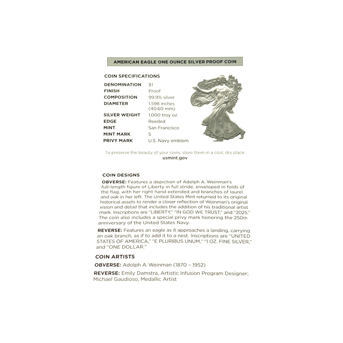 Moneta In Argento Proof Da Un'oncia S$1 American Eagle 250° Anniversario US Navy