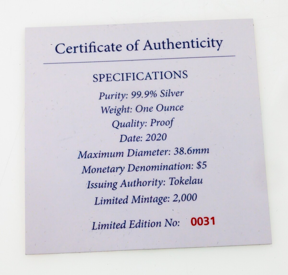 1 Troy Oz di argento 99,9 Numero di serie molto basso 0031 su 2000!