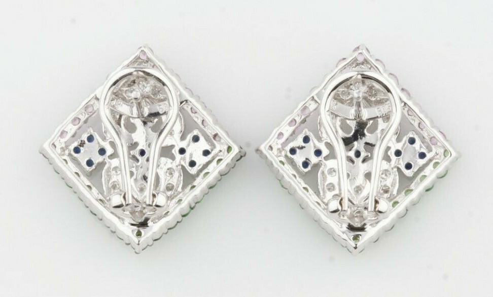 Orecchini Plaque In Zaffiri Multicolore E Diamanti In Oro Bianco 14k 2.87 Ct