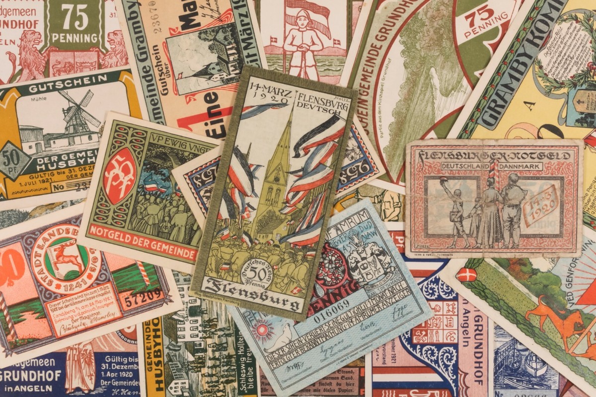 Notas Notgeld del plebiscito de Alemania. Propaganda sobre disputas fronterizas entre Alemania y Dinamarca.