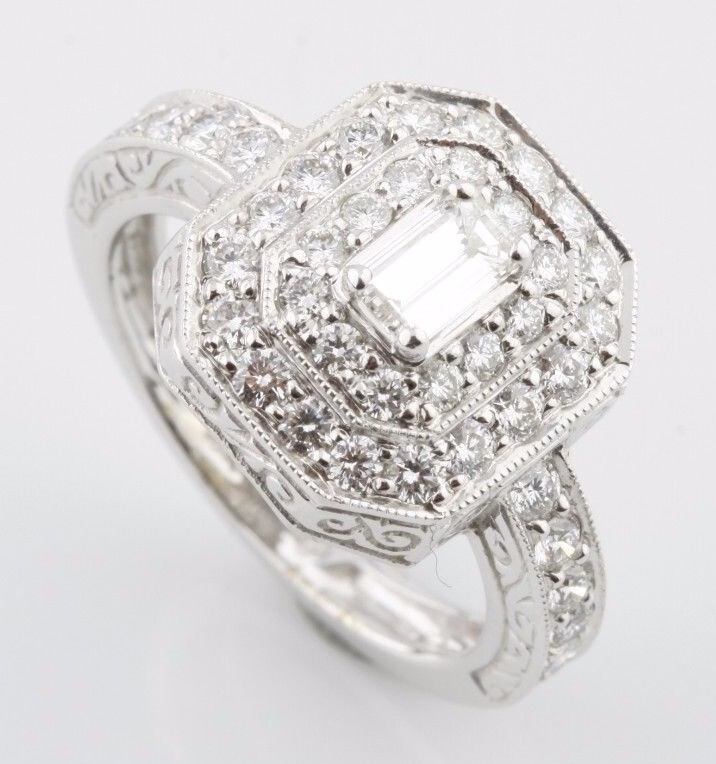 Bellissimo anello diamantato taglio smeraldo in oro bianco da 18k con accenti dimensioni 6 TDW = 1,17 CT