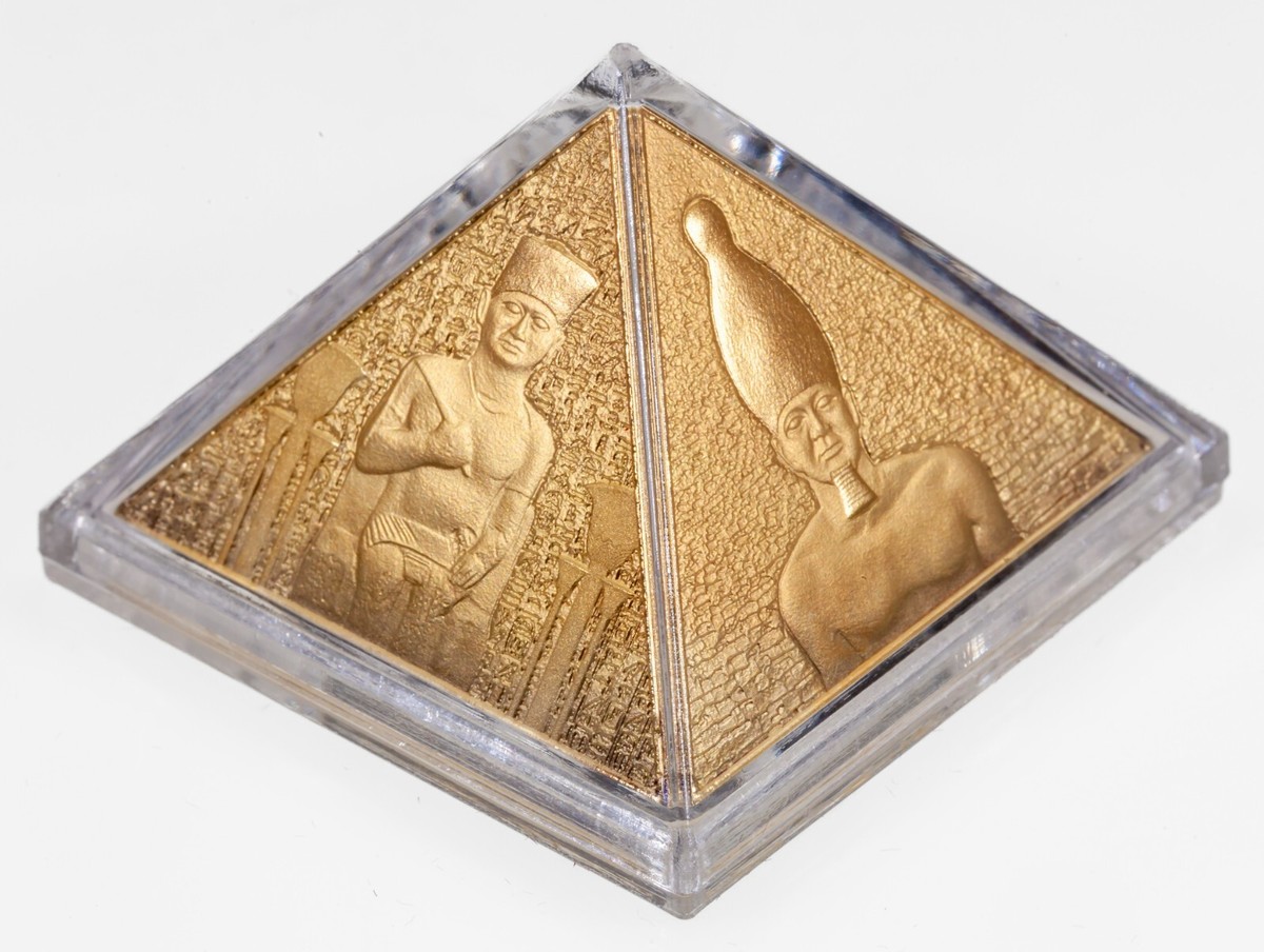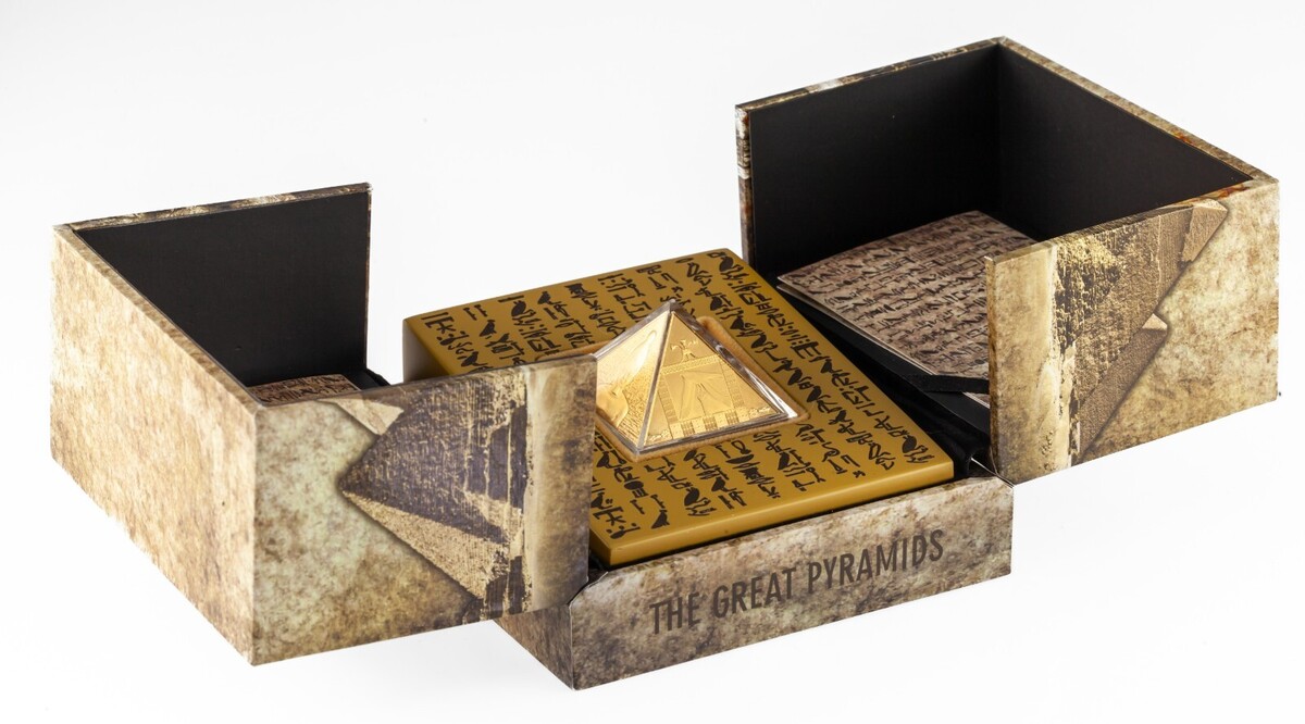 Das Set enthalt 1 3oz. Silberner, vergoldeter, pyramidenformiger Proofbarren ?Die Großen Pyramiden?.