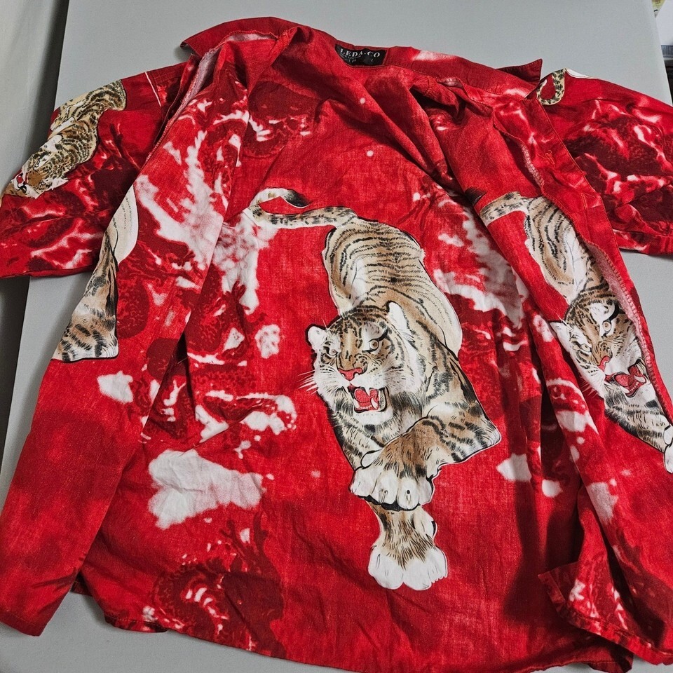 Vintage, Y2K, 90s, Grunge, Streetwear, Tiger Graphic, Dragon Print, All Over Print, Red Button Up, Japanese Style, Cyber Grunge Cotton, Leda Co, Retro, Tatto, Ed Hardy