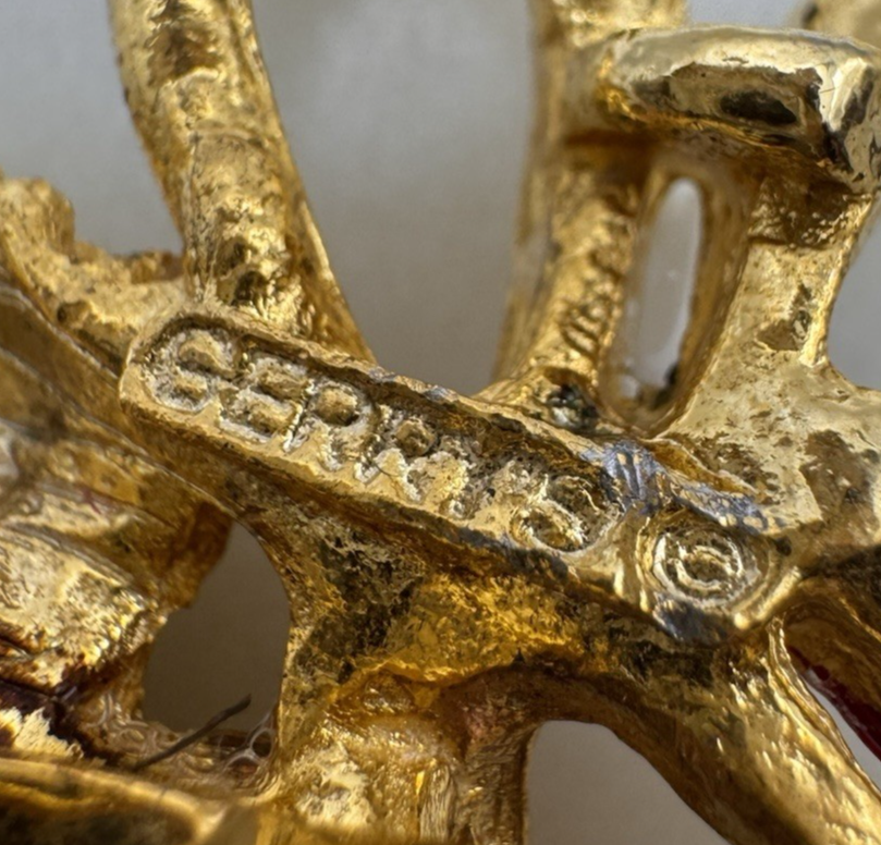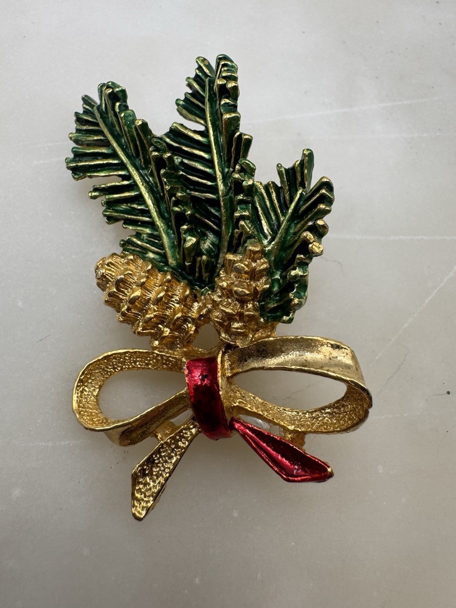 This charming vintage Christmas brooch by Gerry?s features a classic holiday design with detailed gold tone pinecones resting on green enamel evergreen branches, tied together with a bright red ribbon bow. The dimensional pine needles and textured pinecones give the piece beautiful depth and festive character, making it a perfect accessory for holiday sweaters, scarves, coats, or seasonal outfits. Signed Gerry?s on the back, this collectible piece comes from a well-known maker of vintage costume jewelry, especially popular for their whimsical and festive Christmas brooch designs. A lovely piece for collectors of vintage holiday jewelry or anyone looking to add a timeless seasonal accent to their wardrobe.