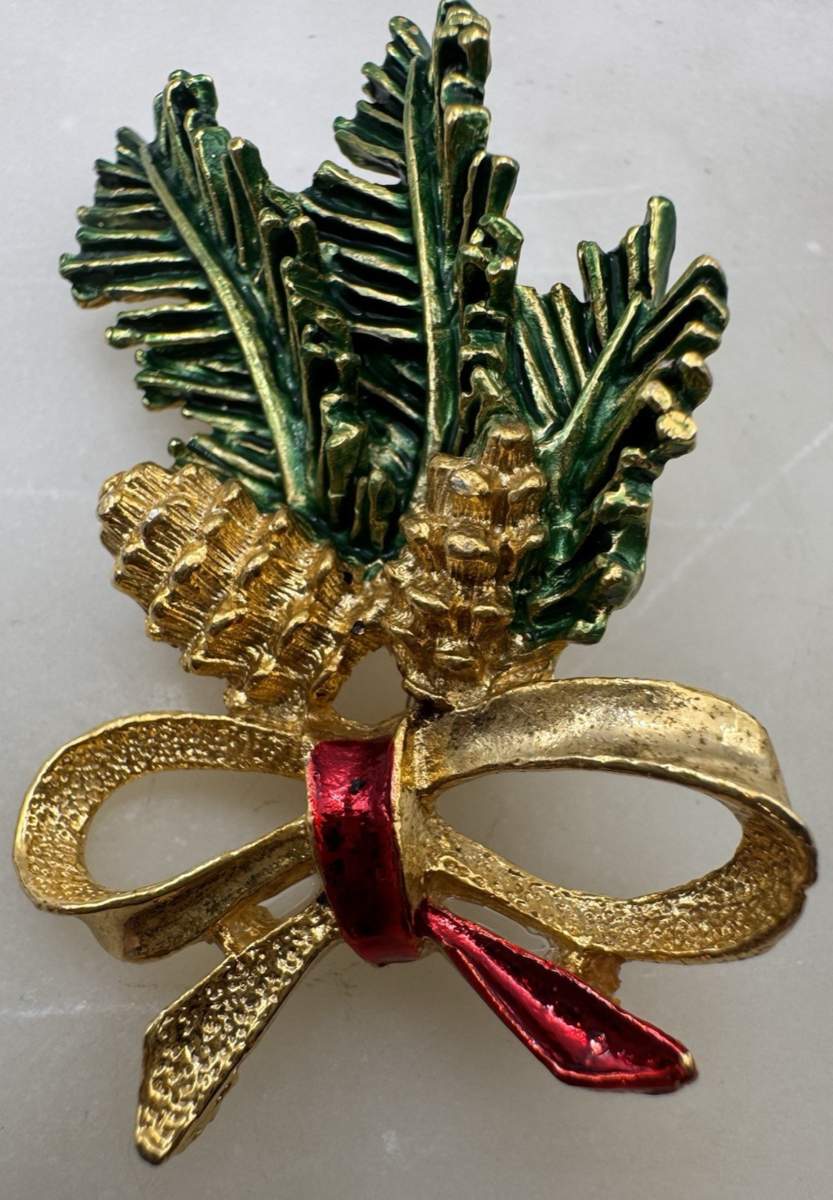 Christmas Pinecone Brooch Gerry's Gold Tone Green Enamel Pine Branch Ribbon Pin