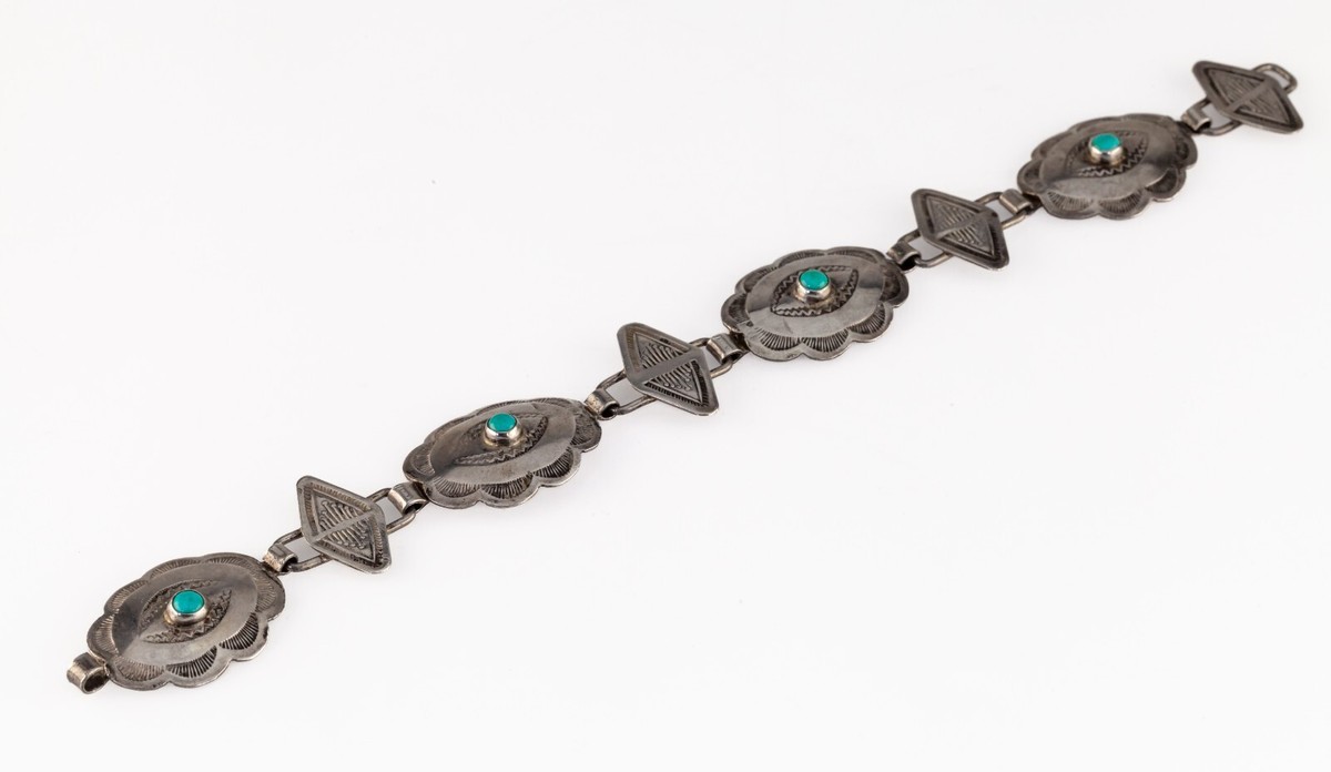 Native American Concha Sterling Silver Bracelet with Turquoise, 8" Long 18.2gr All shipments include insurance and delivery confirmation or signature confirmation. Local Pick-up is available in our showroom. All international packages will have the required customs declaration and value of order. Your continuing satisfaction is very important to us. We offer a 30 day money back return policy. If you are unhappy with your purchase for any reason, please notify us so that we can begin the returns process. All items for sale are available for viewing at our Southern California showroom. We would like to thank all of our loyal customers for their continued support. If you have any questions, comments or concerns, please click "Ask a question" below, and we will respond as soon as possible.