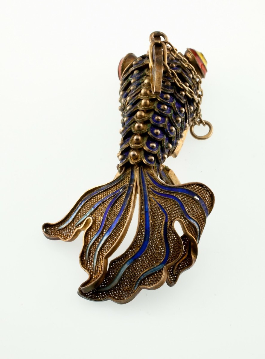 Vermeil Vintage 1920s Chinese Articulated Cloissone Filigree Koi Fish Pendant
