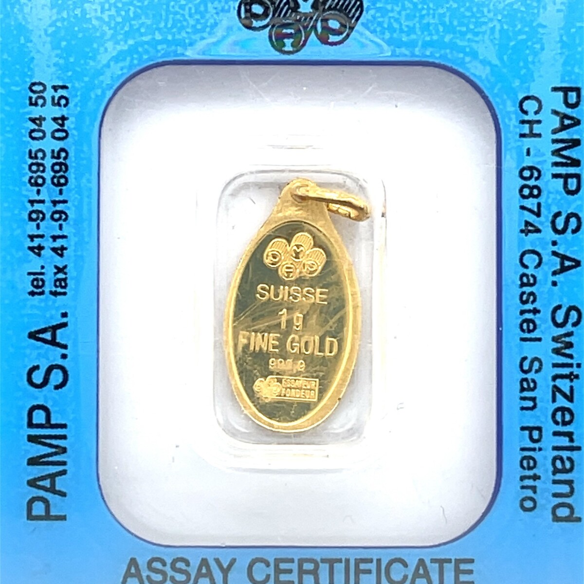 Pamp Suisse Lady Fortuna 1 Gram Fine Gold (999.9) Oval Bar Pendant w/ Bail Assay