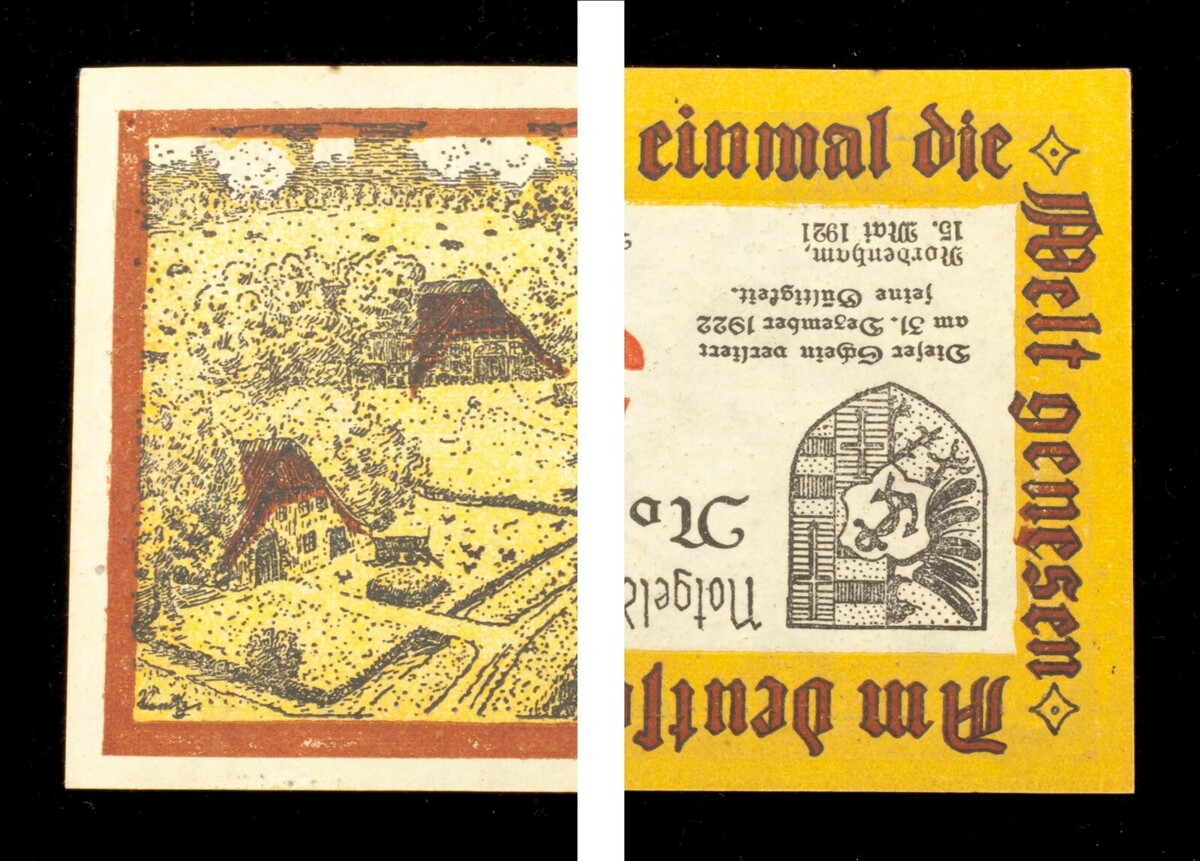 Nota di errore di denaro Notgeld del 1921 da Nordenham, Germania // Errore sul retro invertito