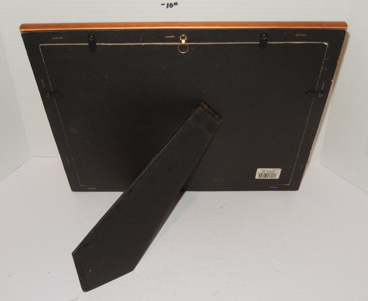 The frame includes an attached easel stand for tabletop display, as well as a hanger for wall mounting.