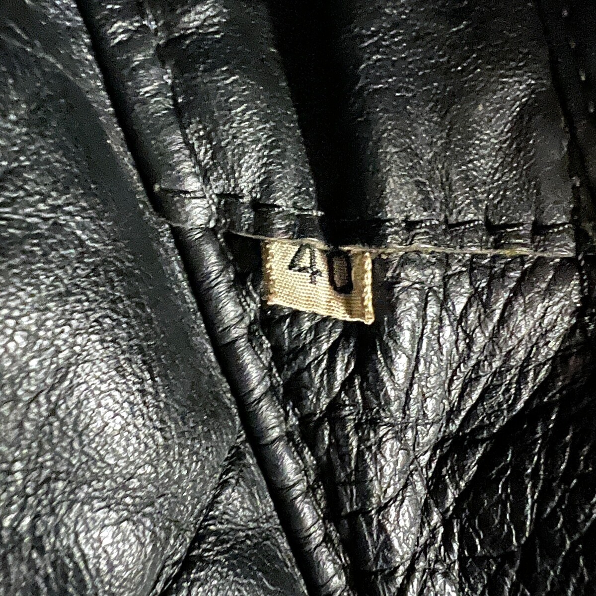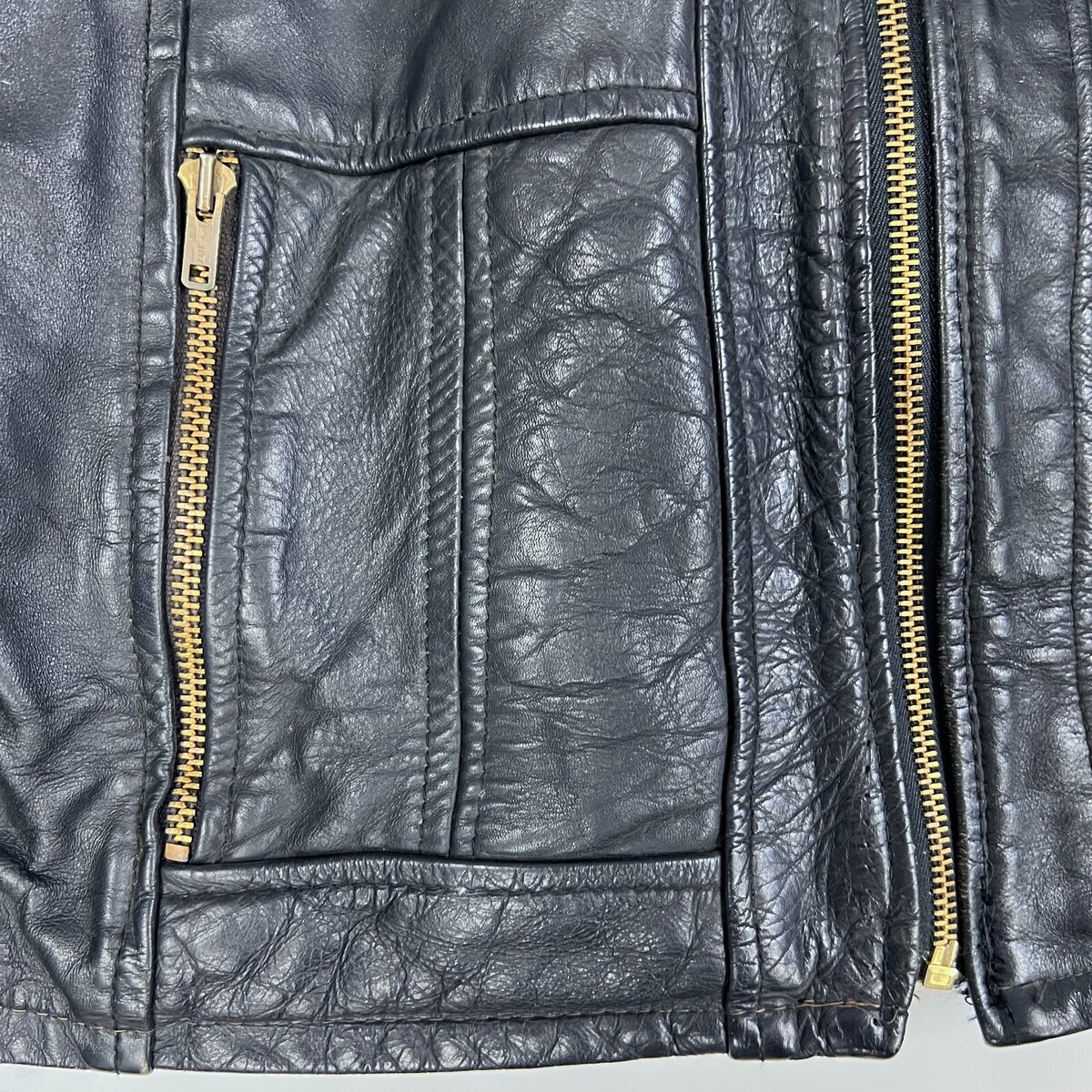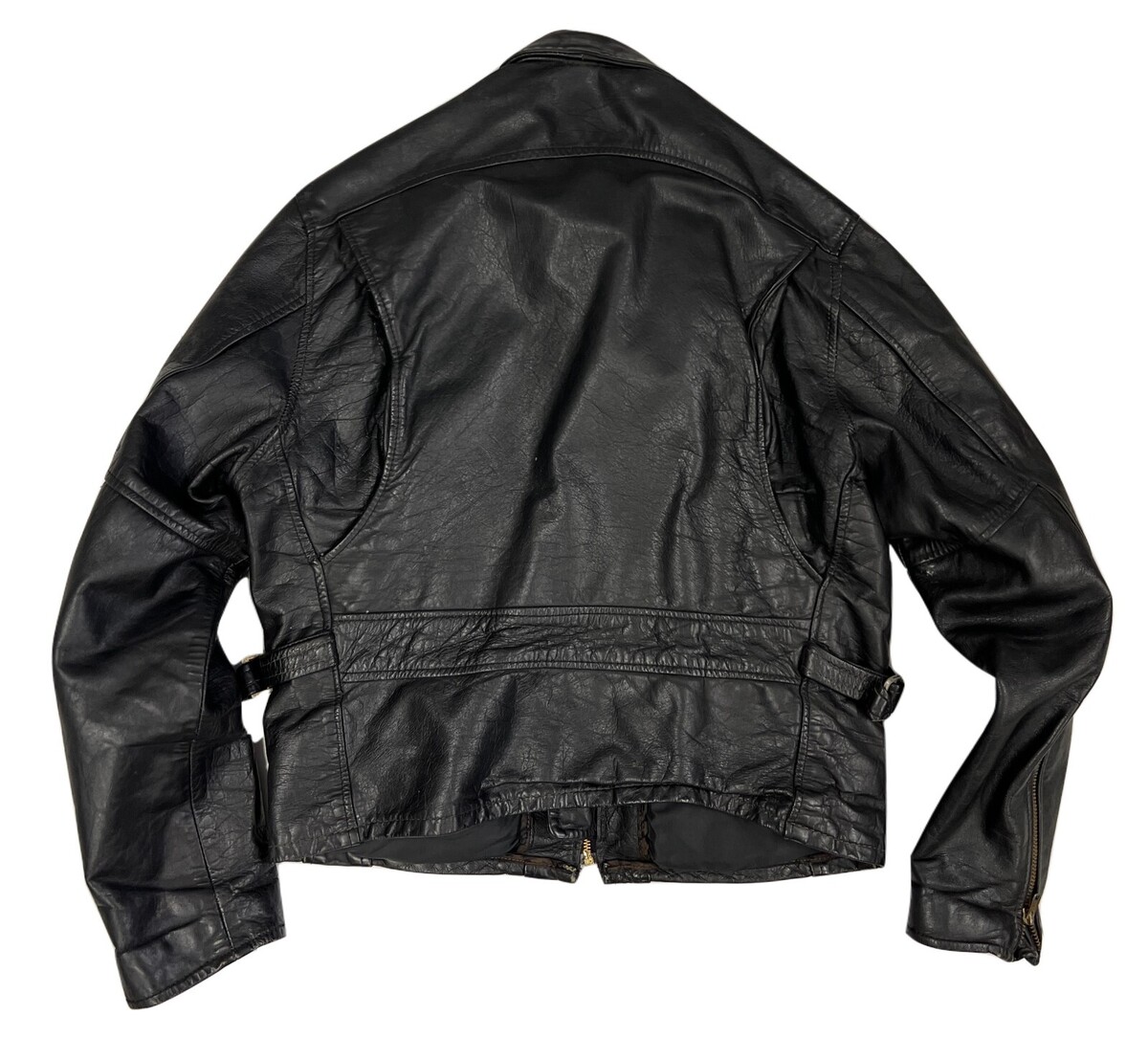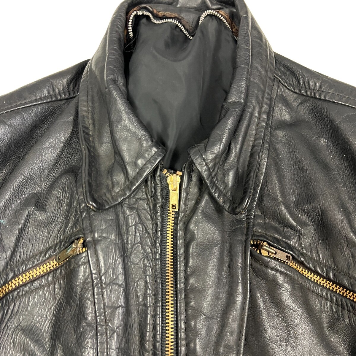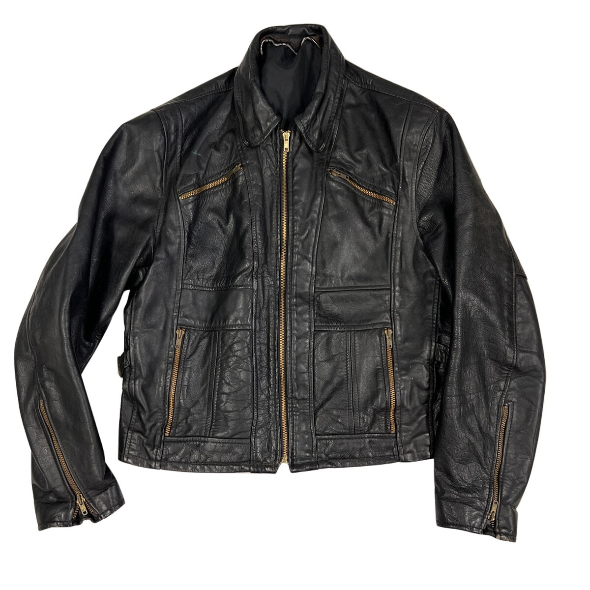 Rare-Vintage 60s-70s Mens Black Leather Motorcycle Jacket Talon Zippers Buckle Sides- Distressed, as found in recent estate. zip-out lining is missing and the teeth of that zipper are shot. The coat lining is good though. Very cool diagonal zippers( talon). All the pocket and front zippers work fine.The main zipper is not marked and all are brass. It has belt buckle side tabs. I can't vouch for exact age but I think 50s- 70s? It's not a soft leather, but I don't think it is horsehide. It is marked size 40.