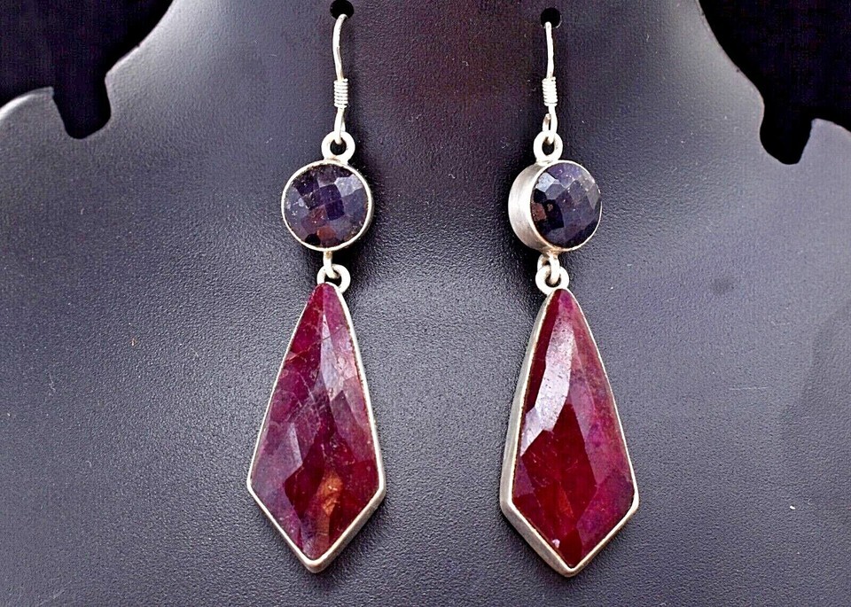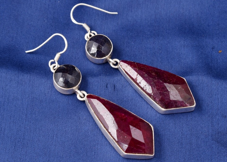 925 Sterling Silver Natural Ruby & Sapphire Women Bezel Earrings Handmade Gift