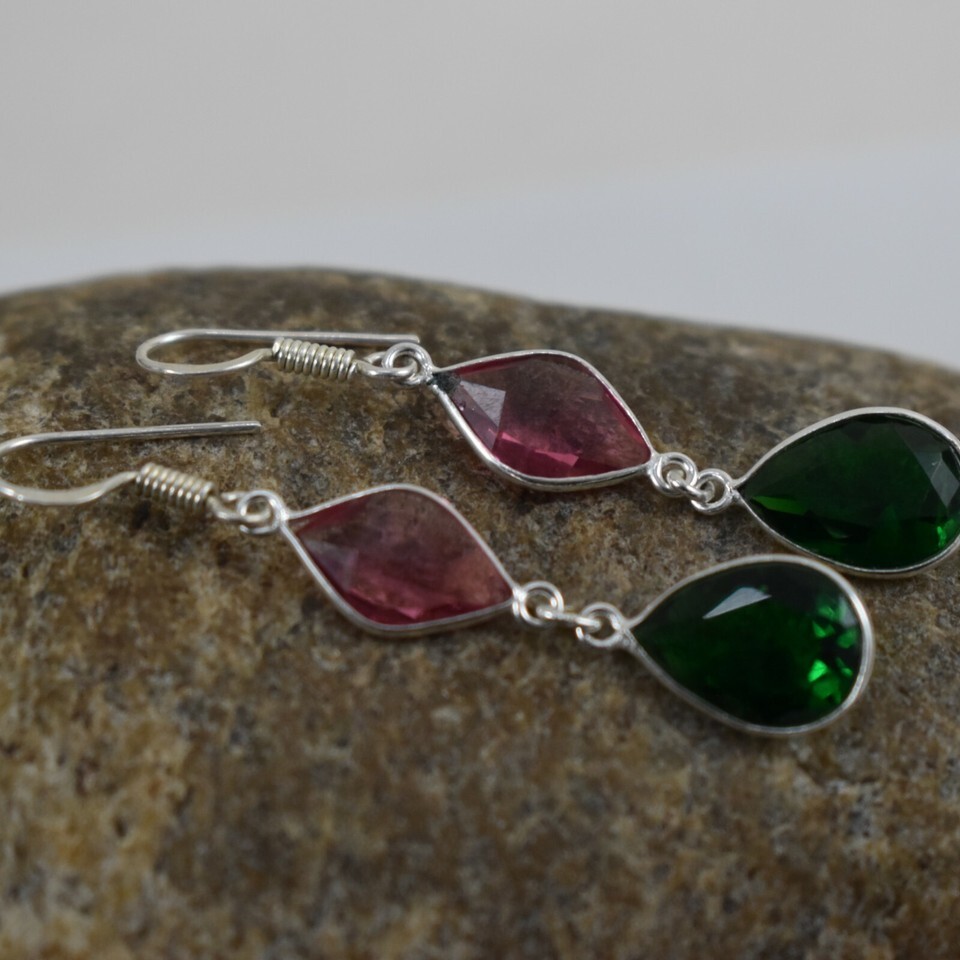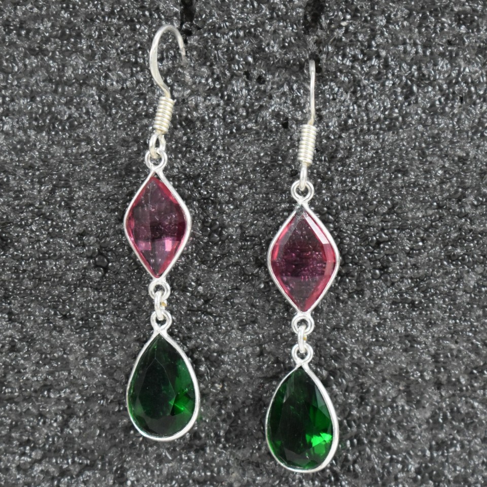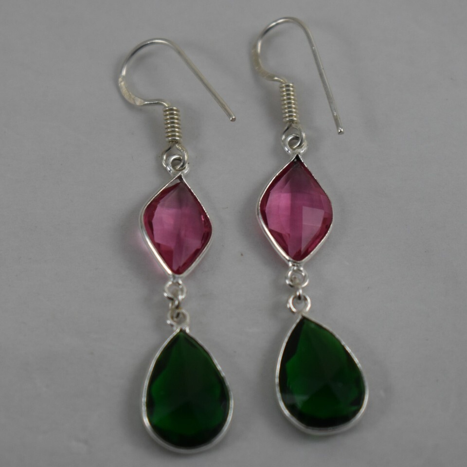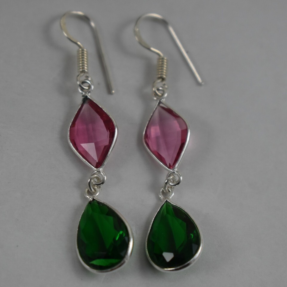 925 Sterling Silver Green Pink Quartz Gemstone Handmade Earring Her Gift BES1360