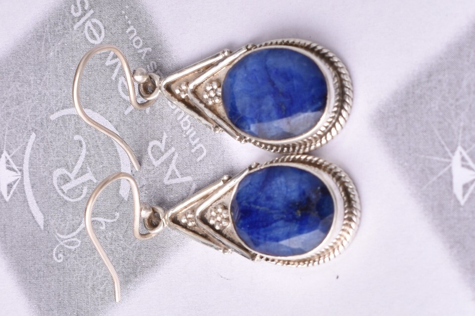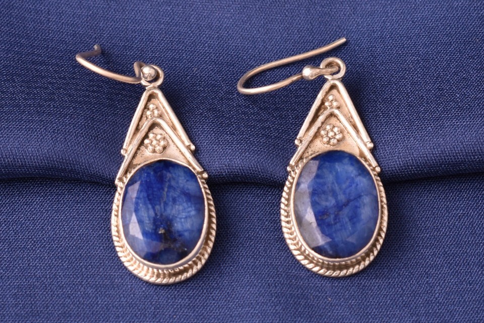 Handmade 925 Sterling Silver Sapphire Gemstone Artisan Dangle Women Earrings