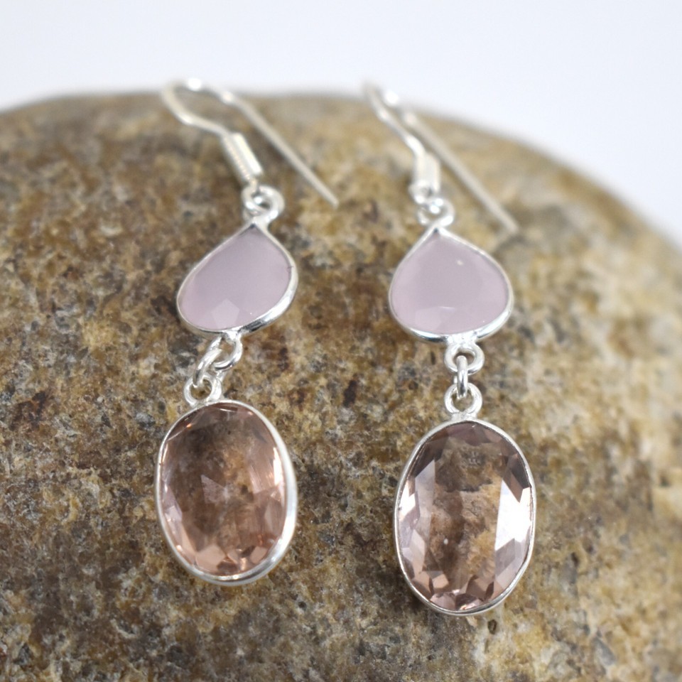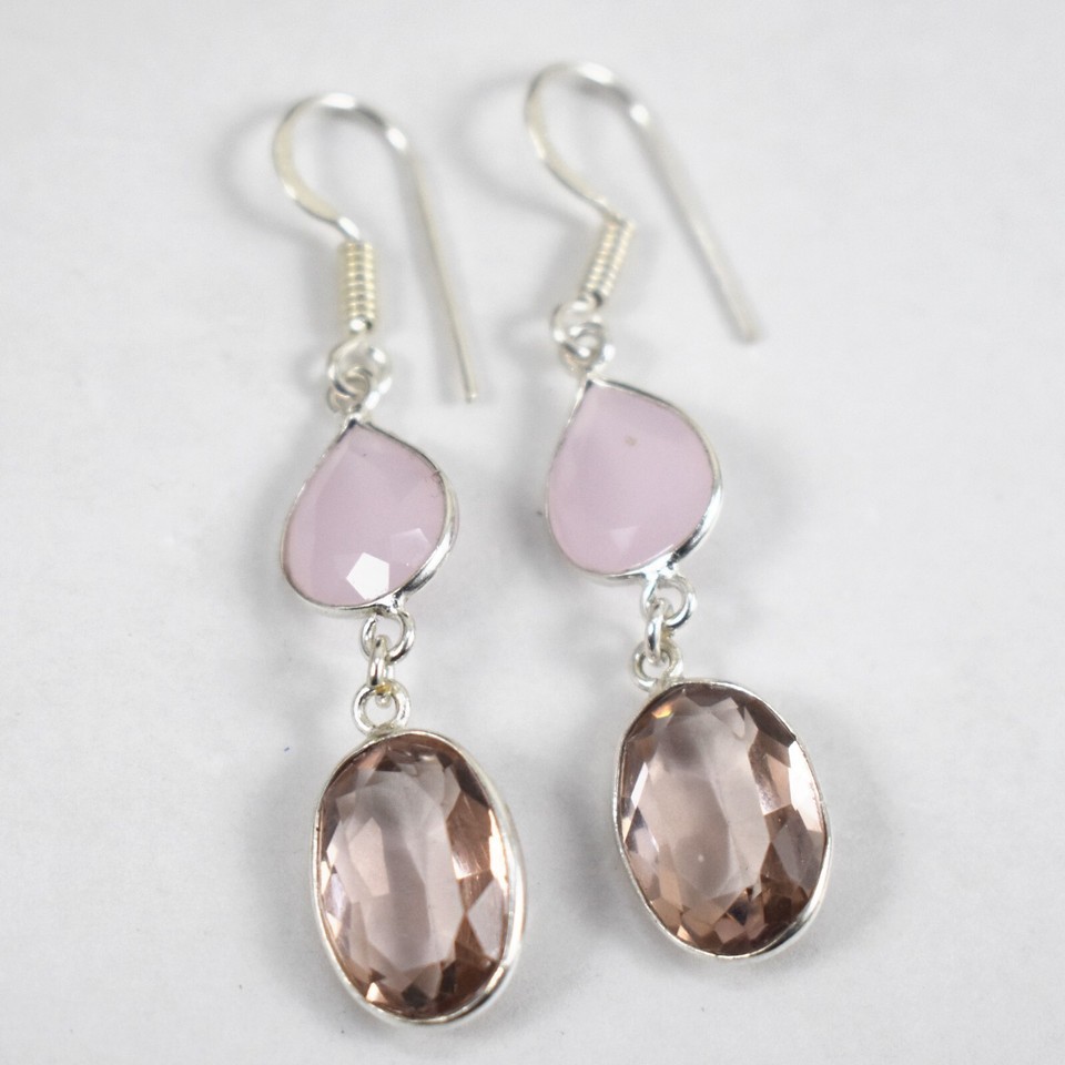 925 Silver Morganite & Rose Quartz Oval Shape silver/Gold/rose Plated Earrings