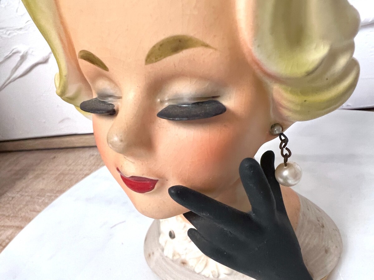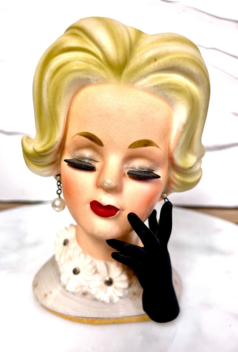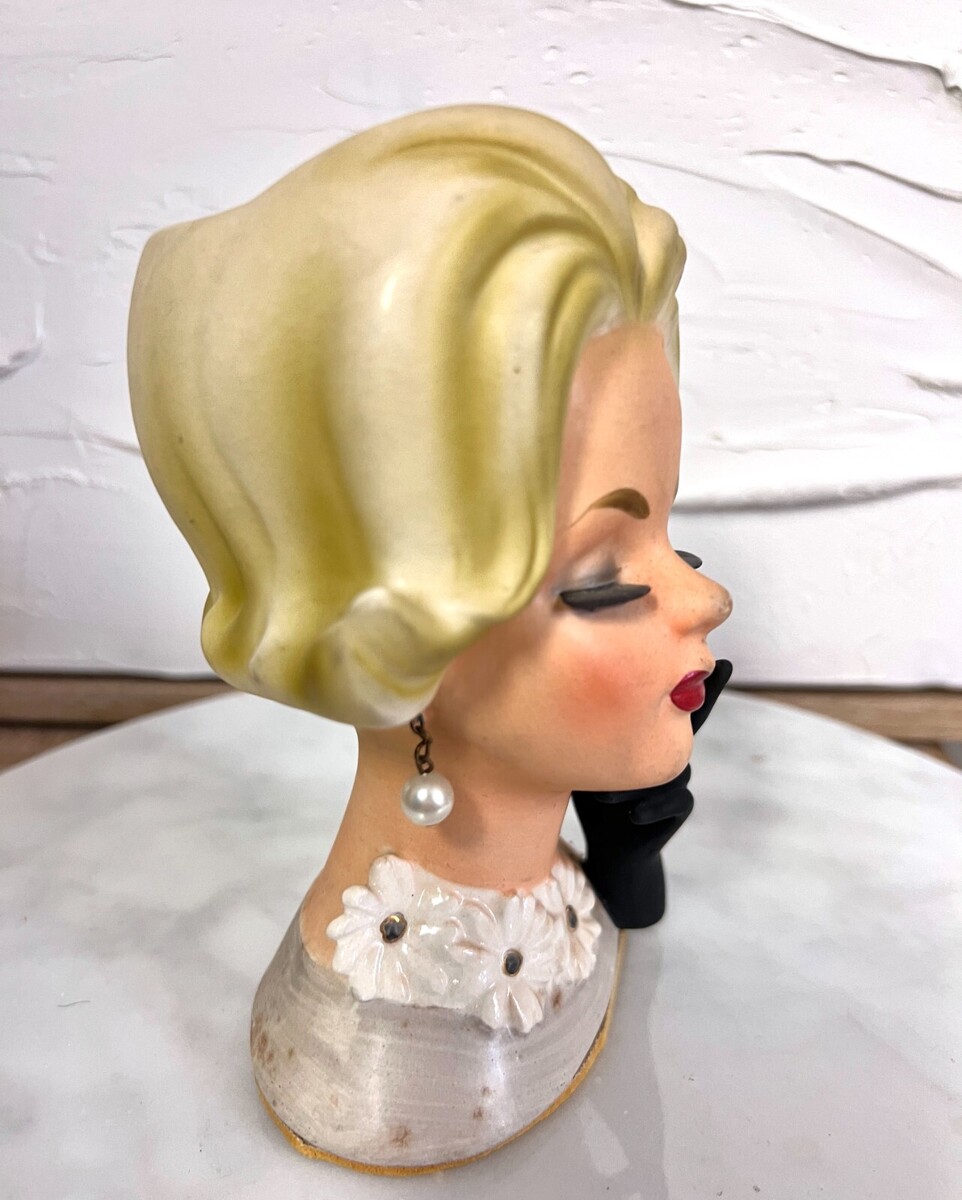 VINTAGE LADY HEAD VASE NAPCO GRAY WITH BLACK GLOVED HAND DAISIES LARGE 6”