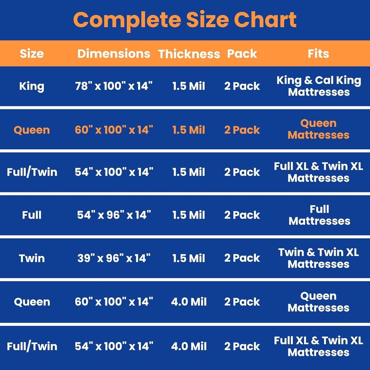 GENEROUS SIZE: Each bag measures 60" 100" 14", providing full coverage for Queen mattresses and accommodating heights up to 14 inches.