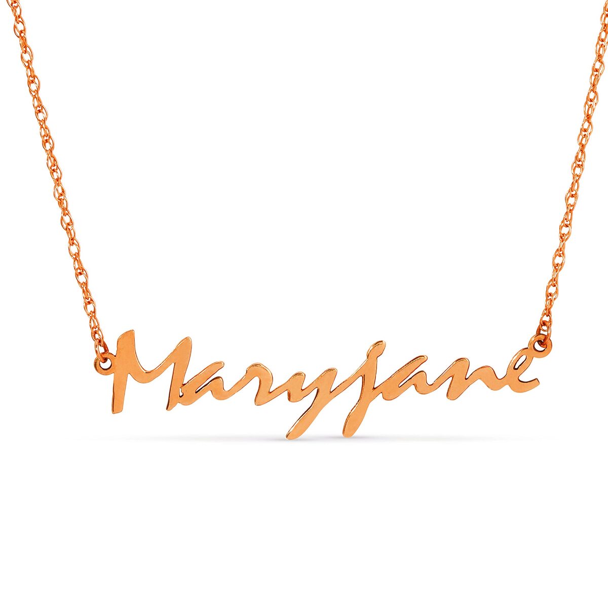 Bullet point: PERSONALIZED NAME NECKLACE: Click "Customize Now" to create your own unique nameplate necklace. Enter one name or word up to 10 characters. The first letter is capitalized, and up to 2 letters can be capitalized. Each nameplate is individually crafted from solid 14K gold.