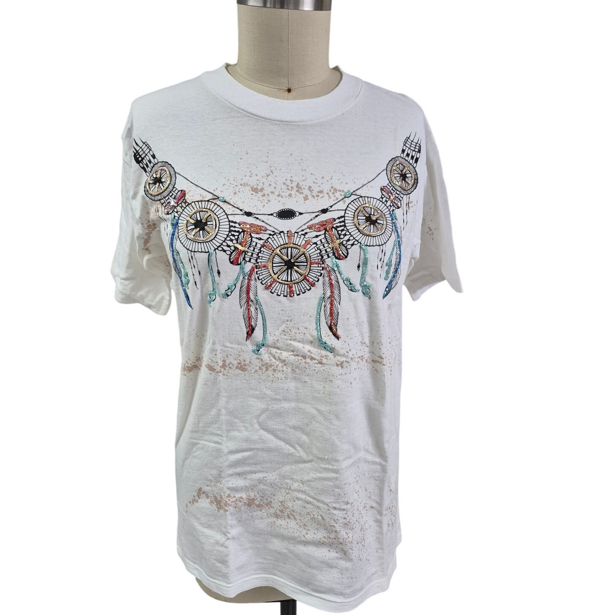 Vtg 80s 90s Roger's Originals White T-shirt Single Stitch Puffy Glitter Tribal Indian L- single stitch tee shirt. excellent condition. No fabric tags, but it feels like 100% cotton.