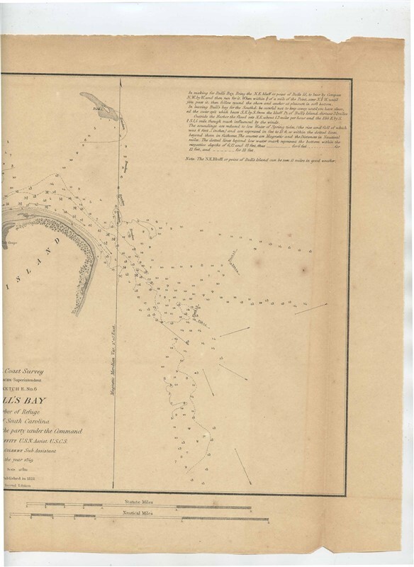 This is Sketch E No 6. Preliminary Sketch of Bull's Bay, Harbor of Refuge By The Hydrographic Party of the US Coast Survey Under the Command of J N Maffitt, LT US Navy. dated 1851. From the Sketches Accompanying the Annual Report of the Superintendent of the United States Coast Survey 1851. The map measures about 11 3/4 x 10 1/4" There is light wear of the formerly bound edge and a topt edge tear and chips. . A very nice original historical drawing, that would look great framed. In fine condition . With detailed Sailing directions and more. . Had been folded in the Annual Report Book.