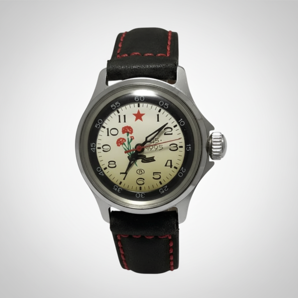 Features a unique commemorative dial with red carnations, a red star, and anniversary inscription.