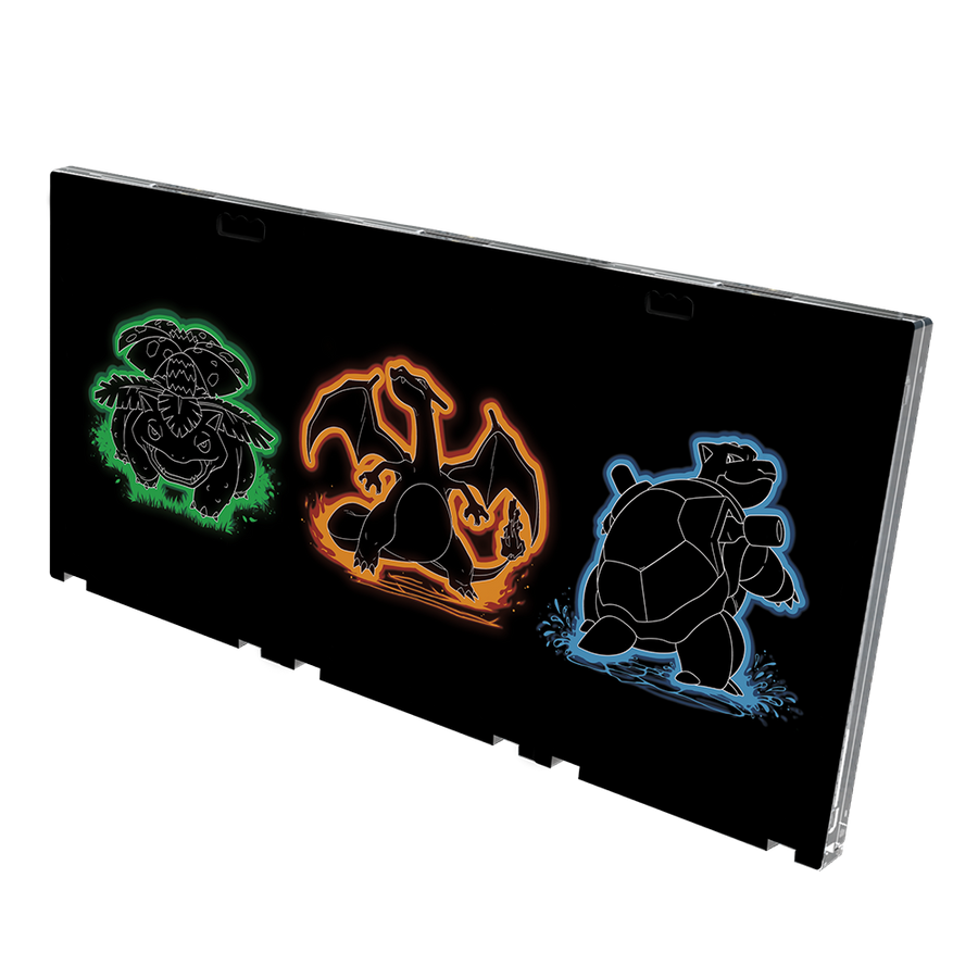 The ONE-TOUCH EDGE? 3-CARD combines the premium protection and style you expect from the individual ONE-TOUCH EDGE? card holder, now with a new design that can hold up to three cards. Designed as the final destination for your collectible trading cards, two-piece ONE-TOUCH 3-CARD holders are uniquely designed with slide-in hinges and magnetic closure so you'll never have to use a screwdriver again. This ONE-TOUCH EDGE? 3-CARD features neon-inspired Venusaur, Charizard, and Blastoise artwork on its back, perfect for showcasing all of the latest and greatest cards in your collection. The holder uses UV-blocking additives to protect your cards from harmful UV rays and is made with non-PVC materials to provide acid-free protection - ensuring your valuable hit retains its condition while under the display. This model can hold standard size Pokemon Trading Card Game cards (2.5 in. x 3.5 in) up to 35pt in thickness. (Cards not included)
