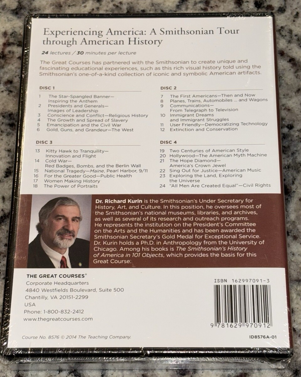 "The Great Courses 8576 - Experiencing America: A Smithsonian Tour/History New" is a 2014 DVD textbook authored by Richard Kurin.