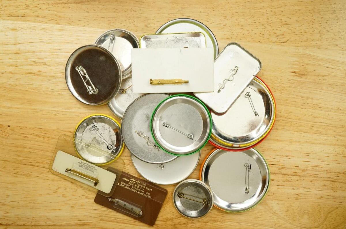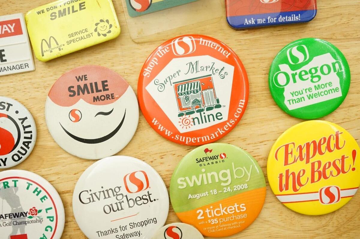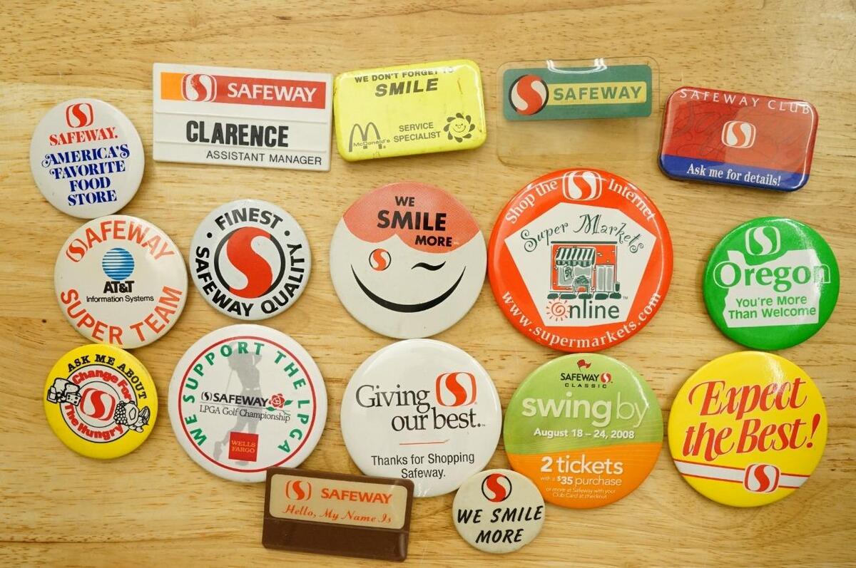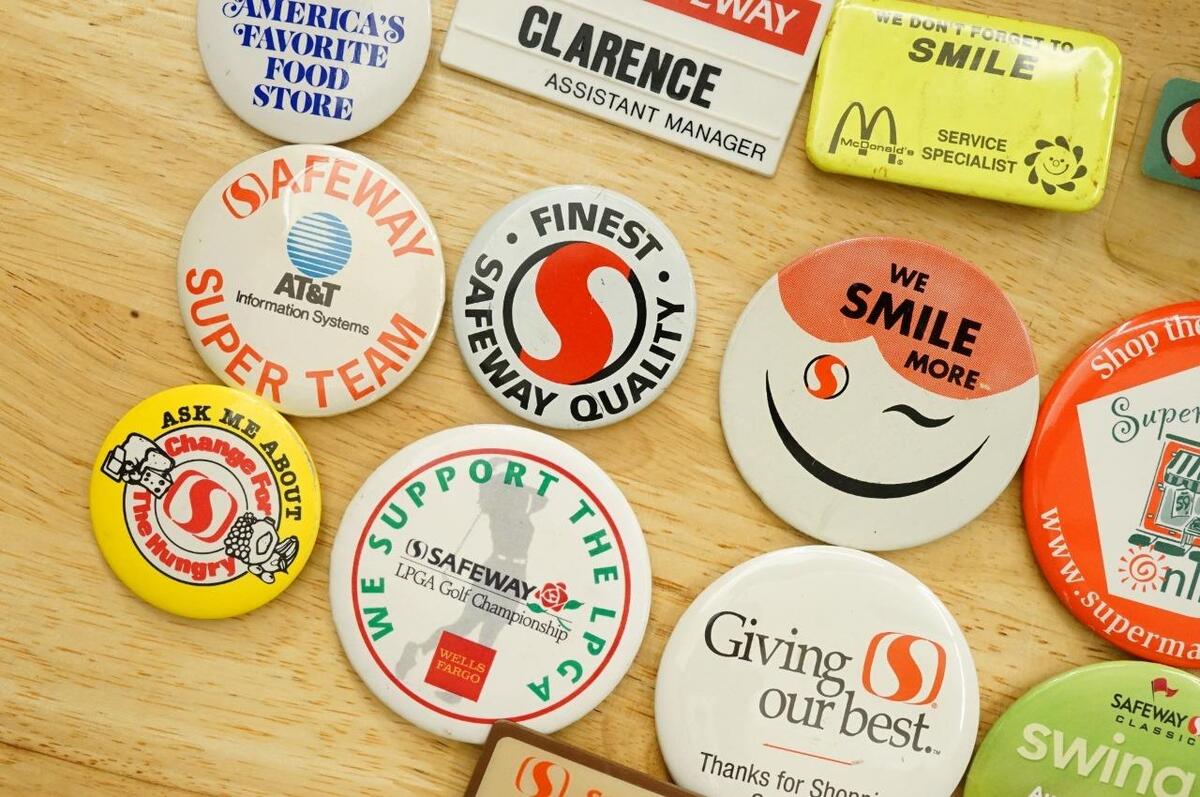 Vintage Pinback Buttons Food Advertising Safeway Grocery Store Employee Promo - variety of sizes and images. Several of the larger ones are 3.5" across as a size reference. No smoke or pet odor.