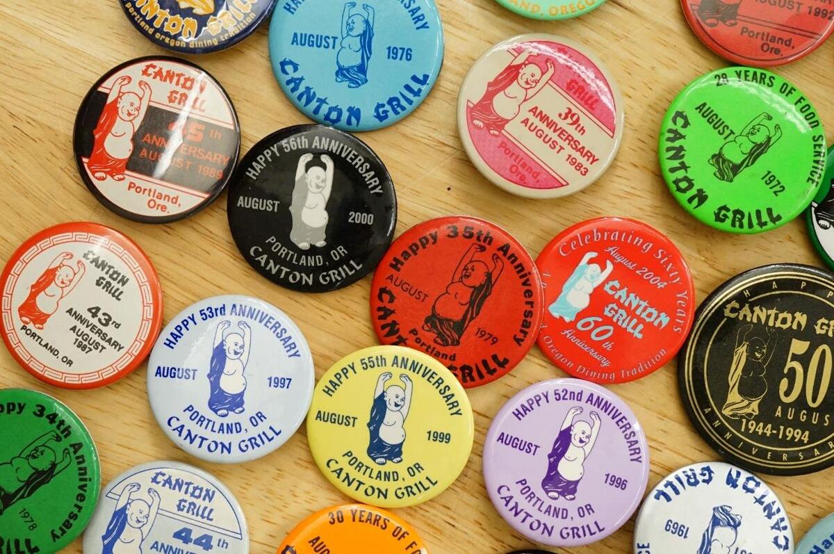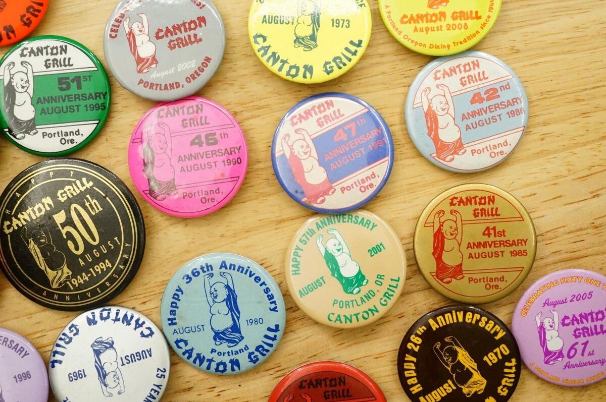 Vintage Pinback Buttons Food Advertising Canton Grill Portland Oregon Restaurant - measures 1.75" across. Variety of images. Anniversary issues. No smoke or pet odor. Was open from 1944 to 2020.