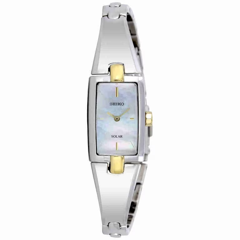 The Seiko SUP218 Women's Core Solar Wristwatch features a sleek design with a mother of pearl dial and two-tone steel band. This solar-powered timepiece is crafted in Japan by the renowned brand Seiko. The elegant silver bezel and case complement the sophisticated design, making it a stylish accessory for any woman's wardrobe. With its analog display and Japanese craftsmanship, this wristwatch offers both functionality and fashion in one timeless piece.