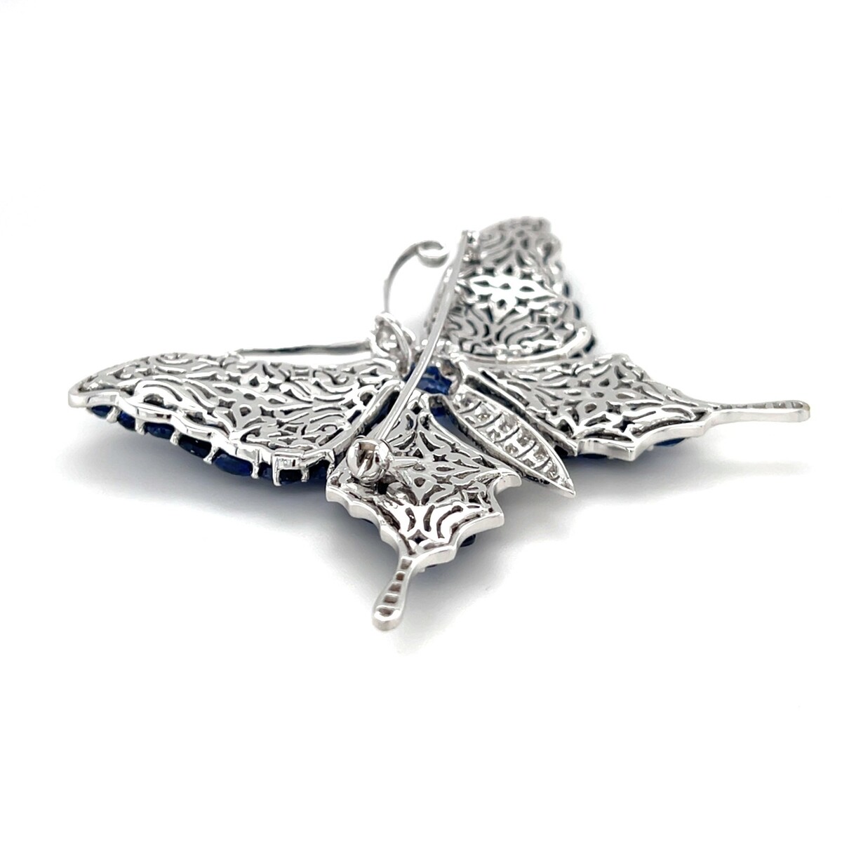 Einige Saphire an der Unterseite des Schmetterlings weisen bis zur Oberflache reichende Einschlüsse auf. Abgerundet durch eine Ose, einen Stiftstiel und einen Verschluss auf der Rückseite. Die Augen sind Rubin-Cabochons mit einem Gewicht von 0,02 ct.