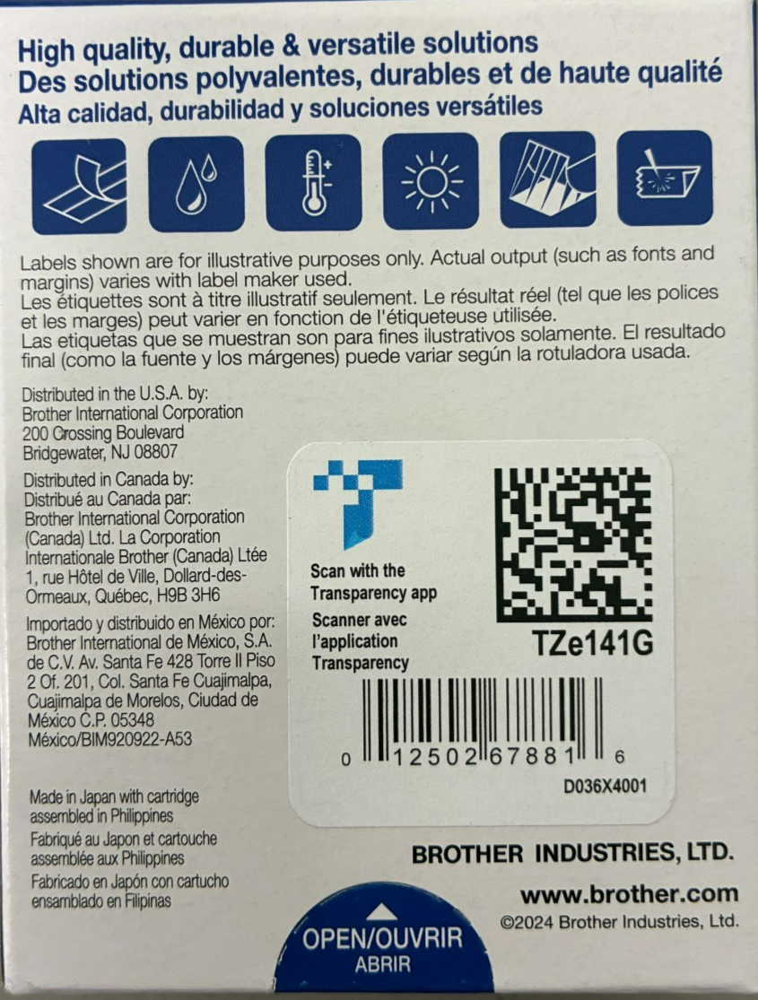 0.7in width - Same Product, Updated Packaging - 7-layer Lamination, Chemical Resistant, Water Resistant, Abrasion Resistant, Temperature Resistant, Fade Resistant, Indoor/Outdoor Use, Easy Peel Split Backing - for use with select Brother P-touch Label Makers