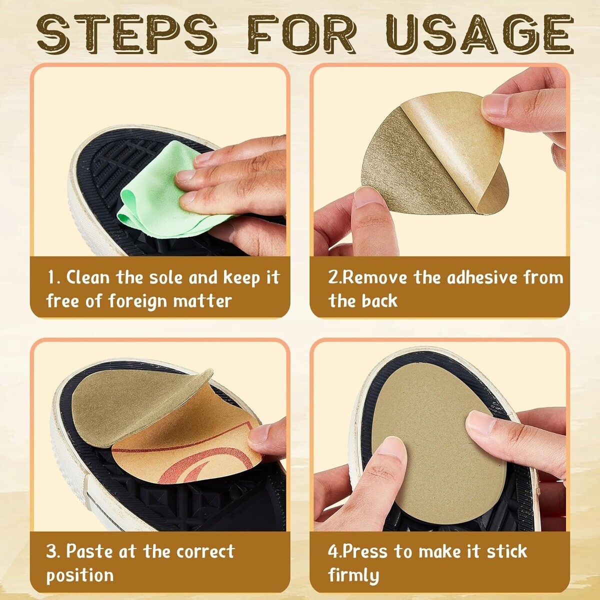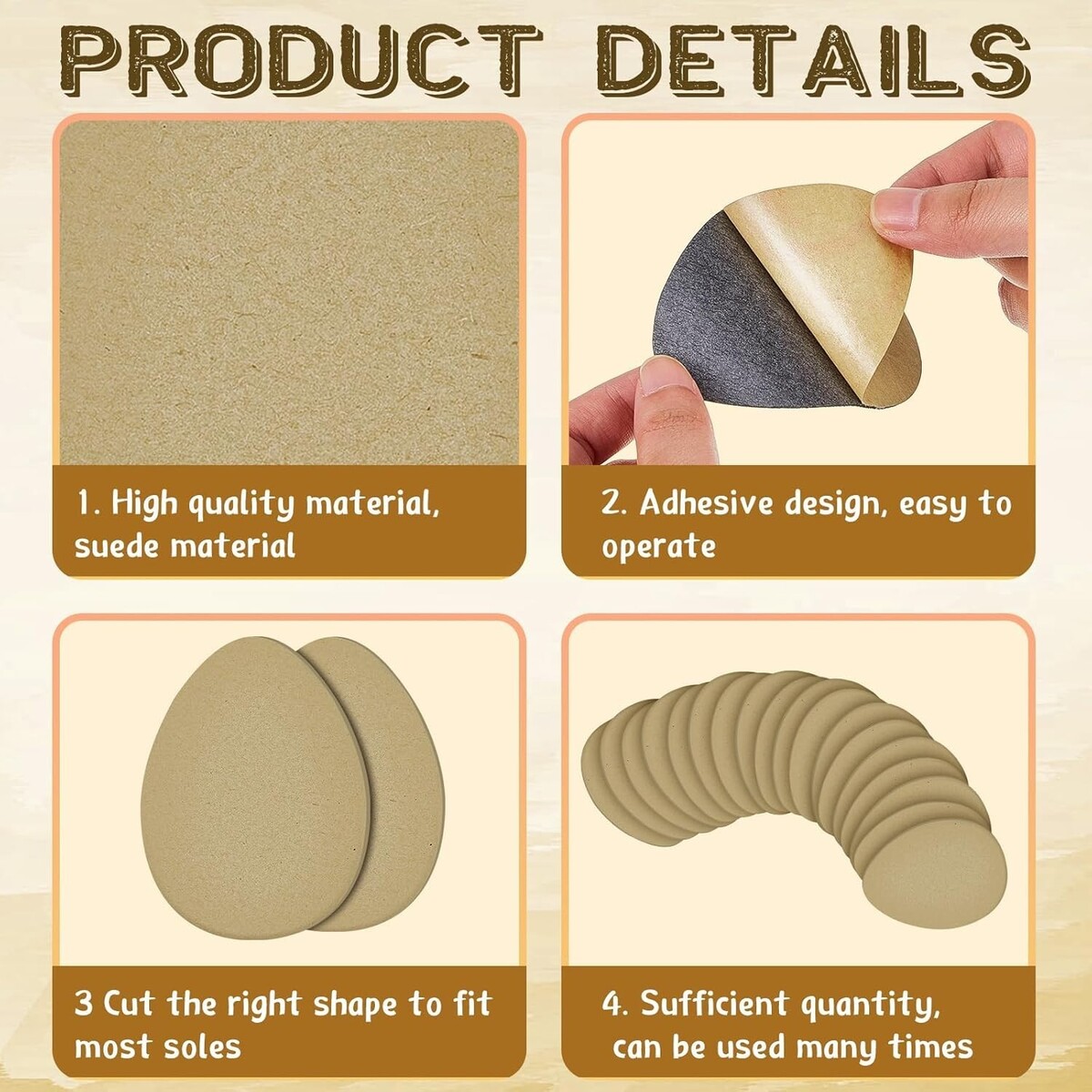 Don't compromise on style or safety. Our Suede Shoe Soles offer an unparalleled combination of durability and elegance, ensuring you never skip a beat while striding through life. With 36 pairs at your disposal, you?re guaranteed to have the perfect fit for every pair of shoes. Whether you're hitting a dance floor or simply walking down the street, our non-slip shoe pads will keep you confident and comfortable.