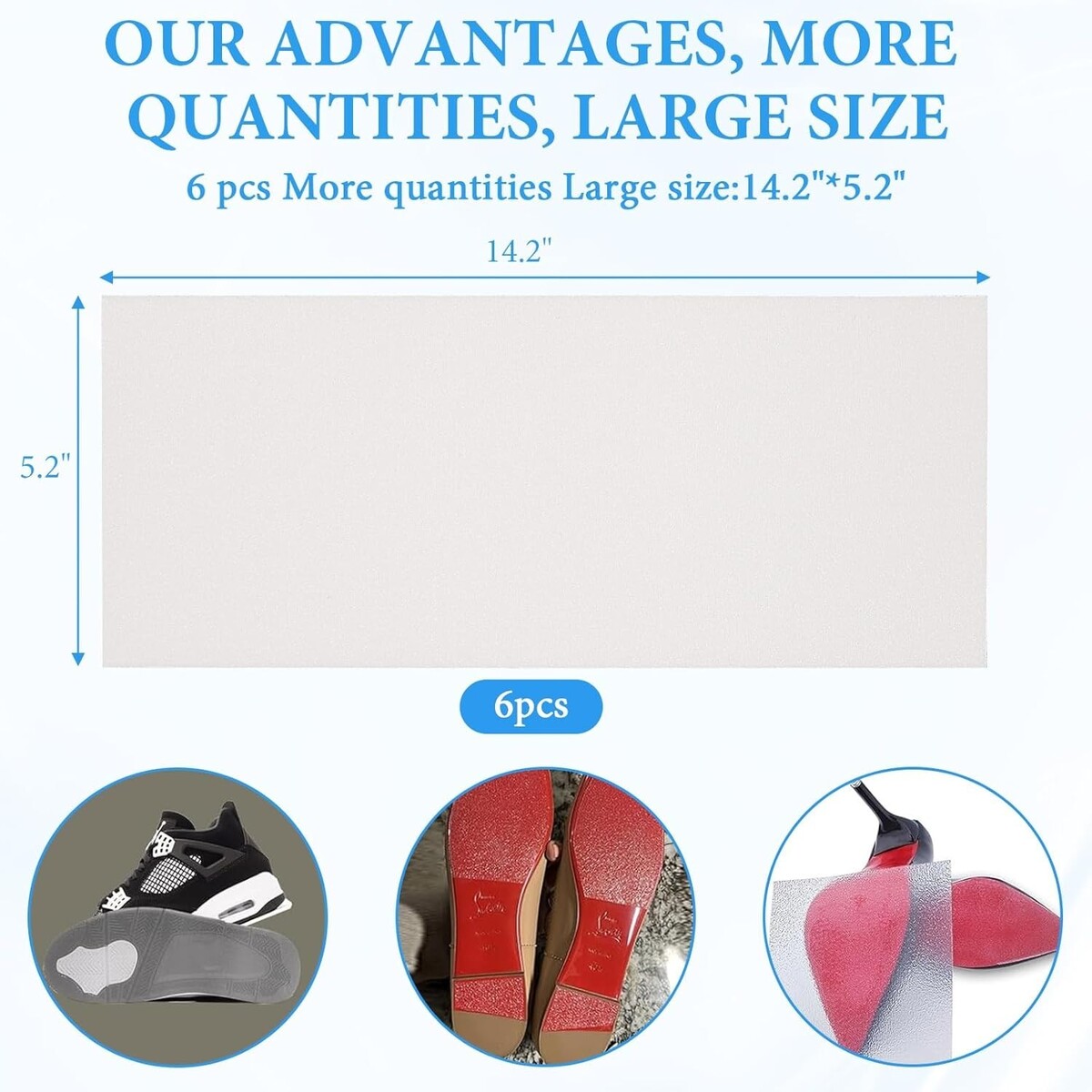 Keep your beloved footwear pristine with our Invisible Anti-Wear Sole Protectors, meticulously engineered to shield your shoes from the wear and tear of daily life. Each pack includes six versatile heel protectors, measuring 15" x 6.1" (38 cm x 15.5 cm), ensuring comprehensive coverage for up to 3 pairs of sneakers or 6-12 pairs of heels.