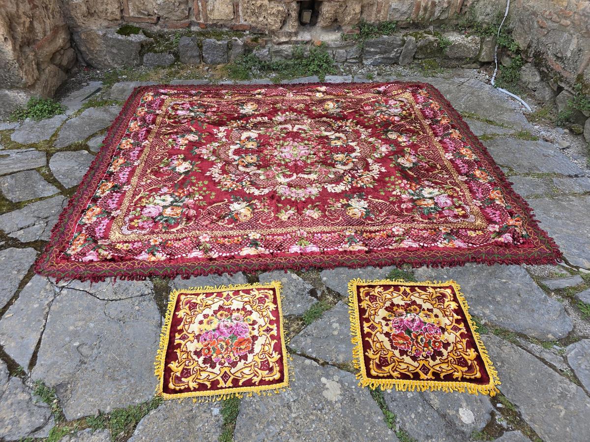This is a beautiful velvet bed cover from the 1970s or the early 1980's. It was made in Italy and made of high quality Italian velvet, by P S the most famous Italian manufacturer known by world's best velvet . The bedspread is in floral pattern, easy to fit in every home interior. The bedspread is tassels decorated at three sides. With the bedspread go two chair pads as well in similar pattern.