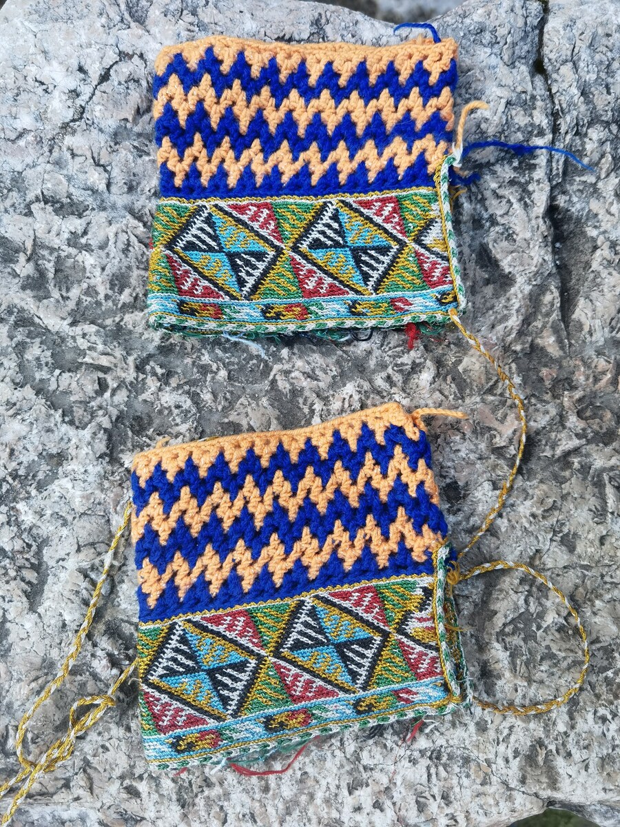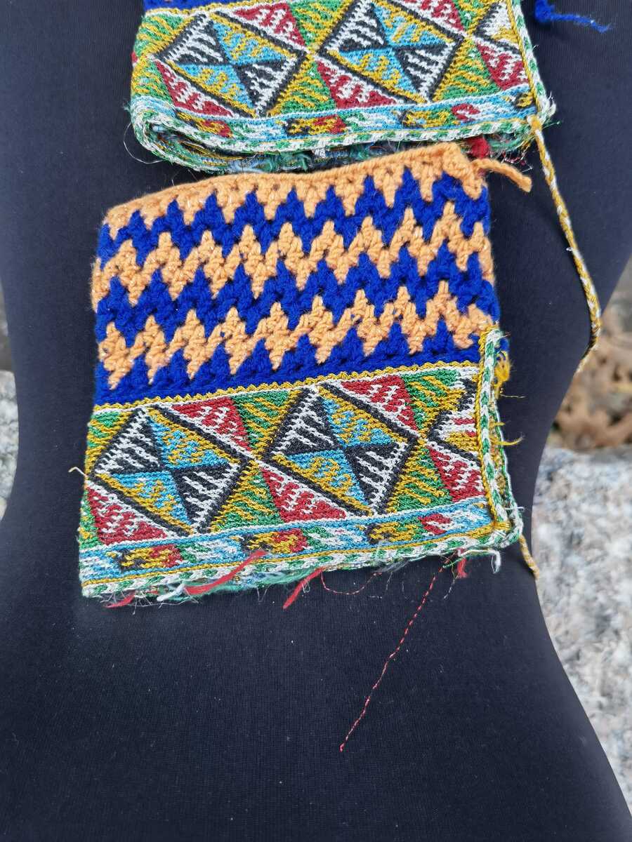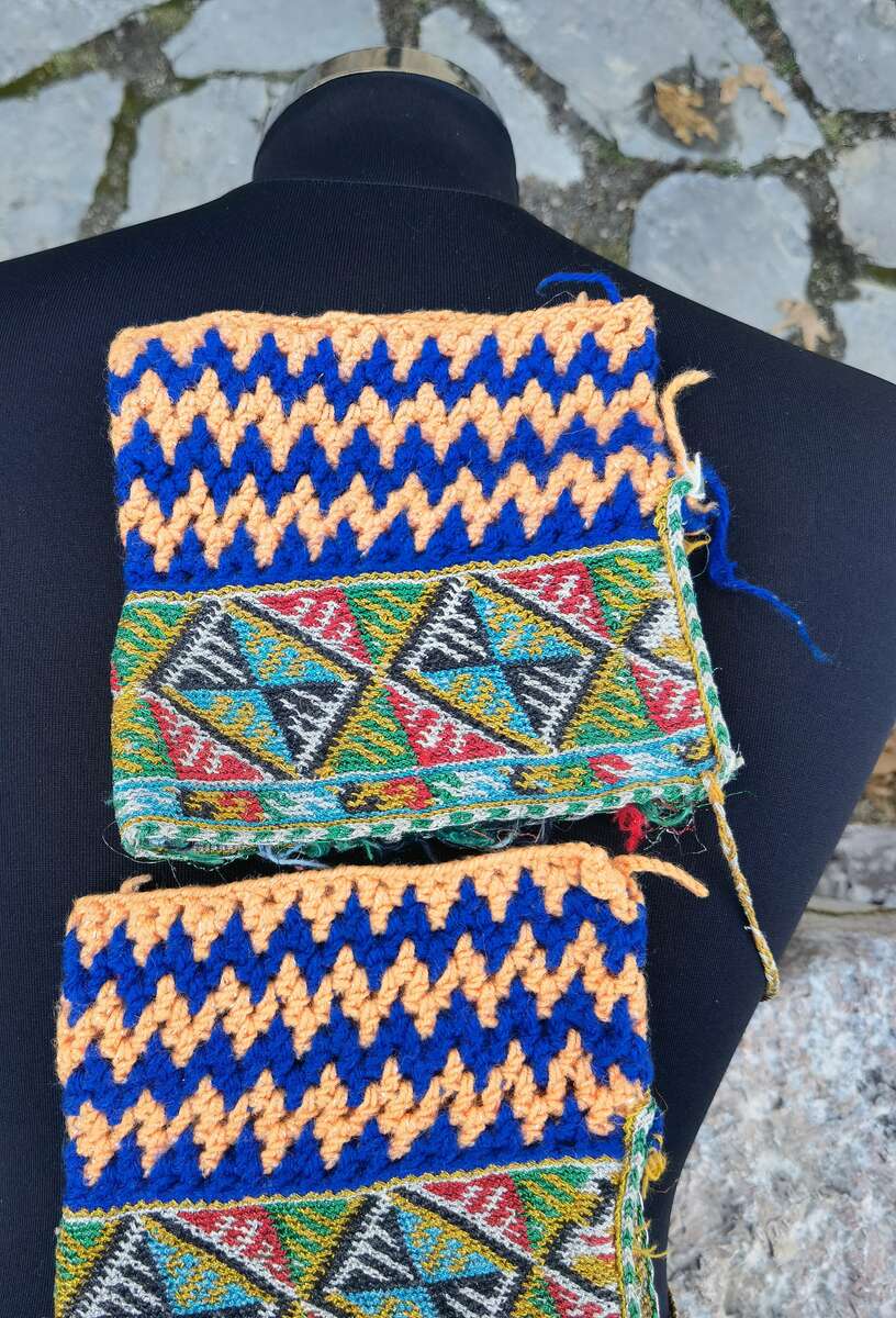 This is a pair of handmade, hand knitted leggings made of wool, extra decorated with silver thread-sirma, srma. The leggings were made in the 1960's or the 1970's but a re kept in exceptional conditions, without damages of any kind. They have never been worn before. Lovely made, complex, detailed pattern and many colors to present in a small fashion attachment. Beside its original use they can be used as a sleeves patch or you can find any other use by your imagination and creativity.