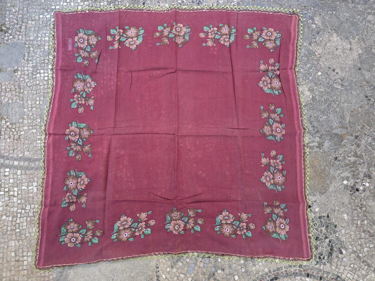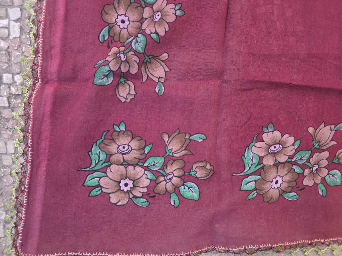 Red floral headscarf adorned with yellow fringe, vintage bohemian scarf