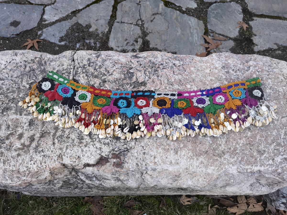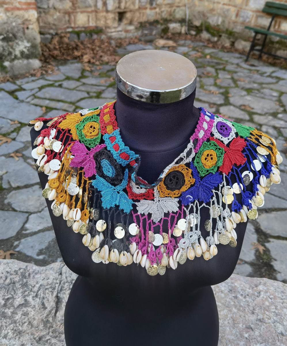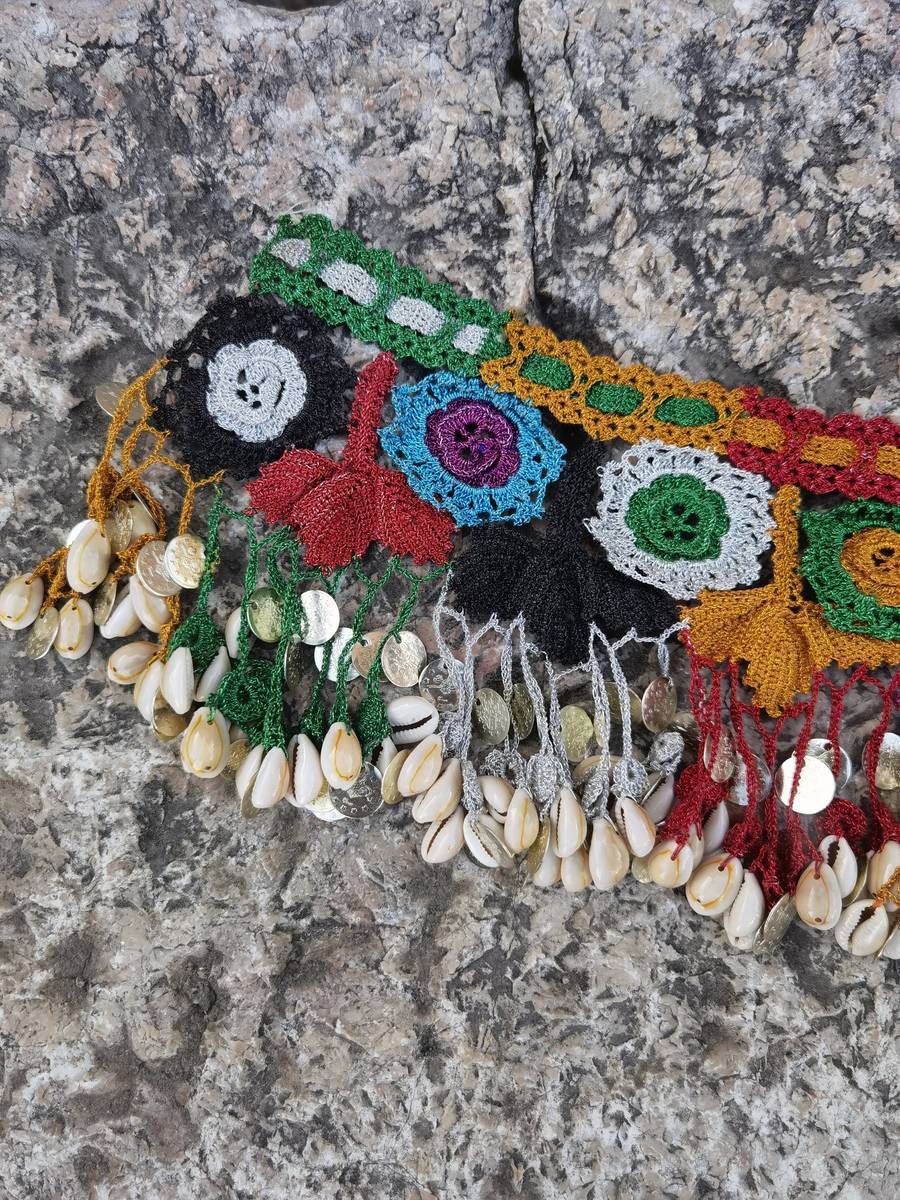 This is a handmade, hand knit crochet neckline patch, decorated with shells, made in the 1960's or the 1970's. A lot of hours of hard handwork were invested in the making of this piece. It is kept in a very good condition for its age, without damages. This lovely handmade colorful piece can be used as a neckline decorative patch, as a necklace itself, piece of waist decoration, belly dance decorative patch etc. The imagination and creativity are only limits of the use of this lovely unique handmade piece.