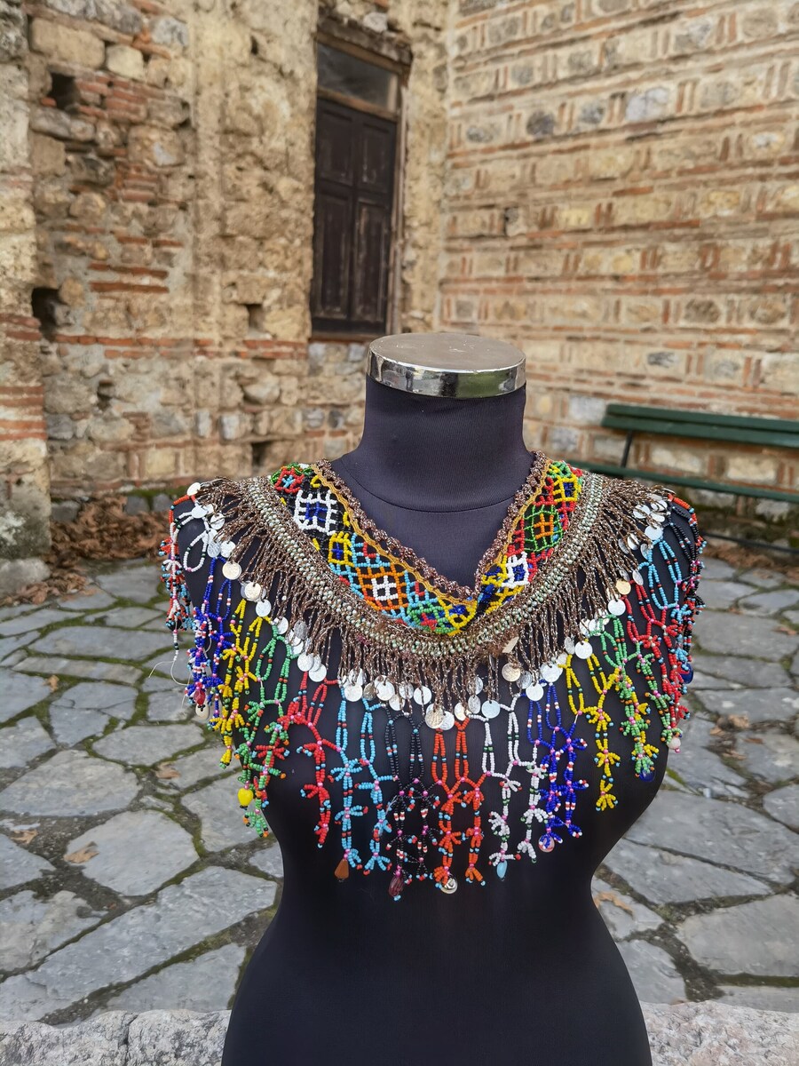This is a handmade, beads made neckline patch, decorated with small coins, made in the 1960's or the 1970's. A lot of hours of hard handwork were invested in the making of this piece. It is kept in a very good condition for its age, without damages. This lovely handmade colorful piece can be used as a neckline decorative patch, as a necklace itself, piece of waist decoration, belly dance decorative patch etc. The imagination and creativity are only limits of the use of this lovely unique handmade piece.