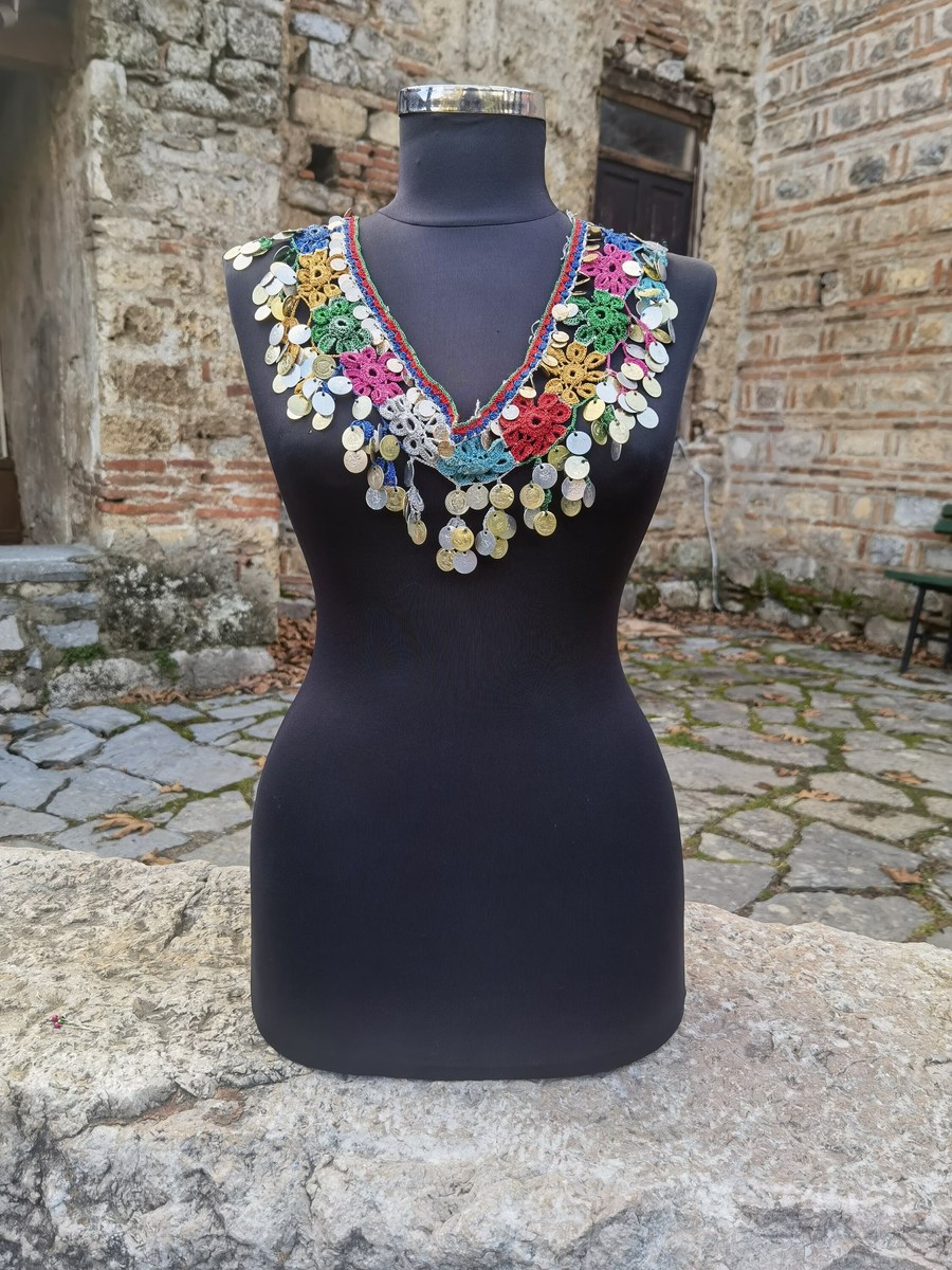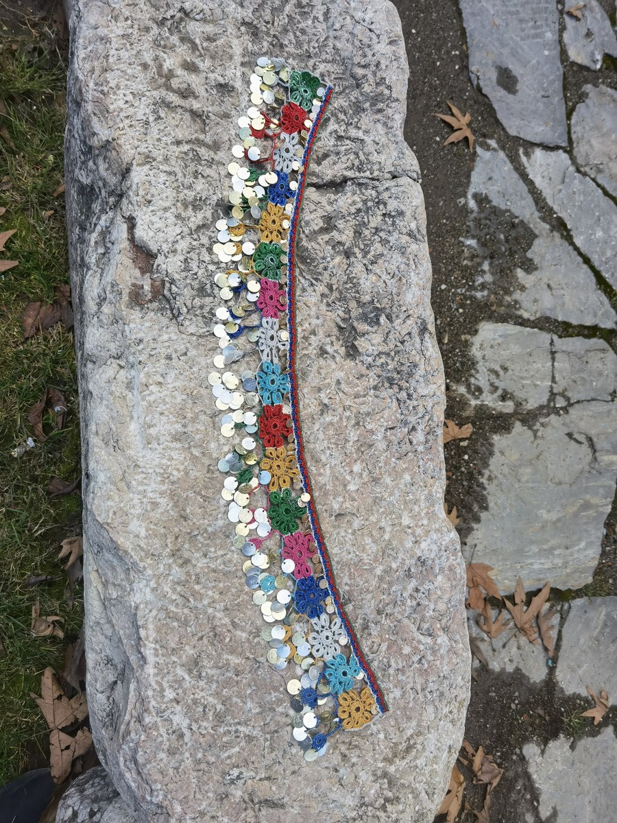 This is a handmade, hand knitted crochet neckline patch, decorated with coins, made in the 1960's or the 1970's. It is kept in a very good condition for its age, without damages. This lovely handmade colorful piece can be used as a neckline decorative patch, as a necklace itself, piece of waist decoration, belly dance decorative patch etc. The imagination and creativity are only limits of the use of this lovely unique handmade piece.