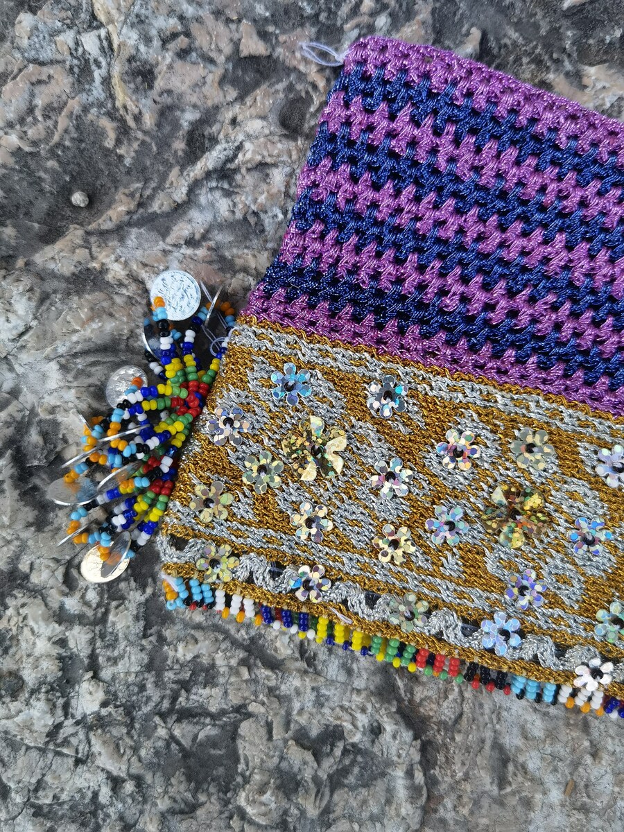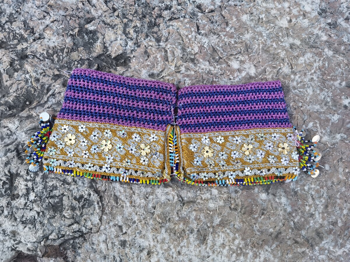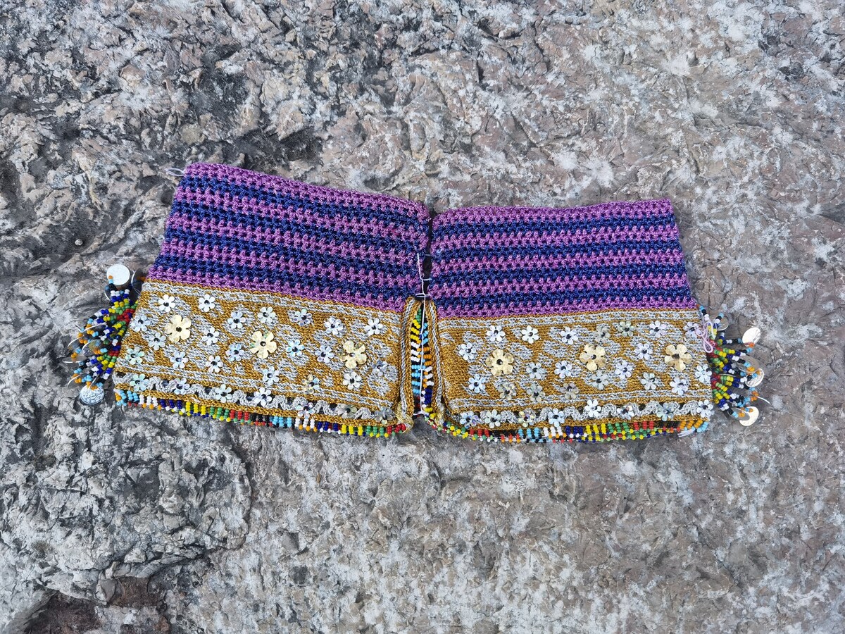 This is a pair of amazing looking handmade, hand knitted leggings made of wool, extra decorated with sirma thread and sequins. The leggings were made in the 1960's or the 1970's but a re kept in exceptional conditions, without damages of any kind. They have never been worn before. Lovely made, complex, detailed pattern and many colors to present in a small fashion attachment. Beside its original use they can be used as a sleeves patch or you can find any other use by your imagination and creativity.